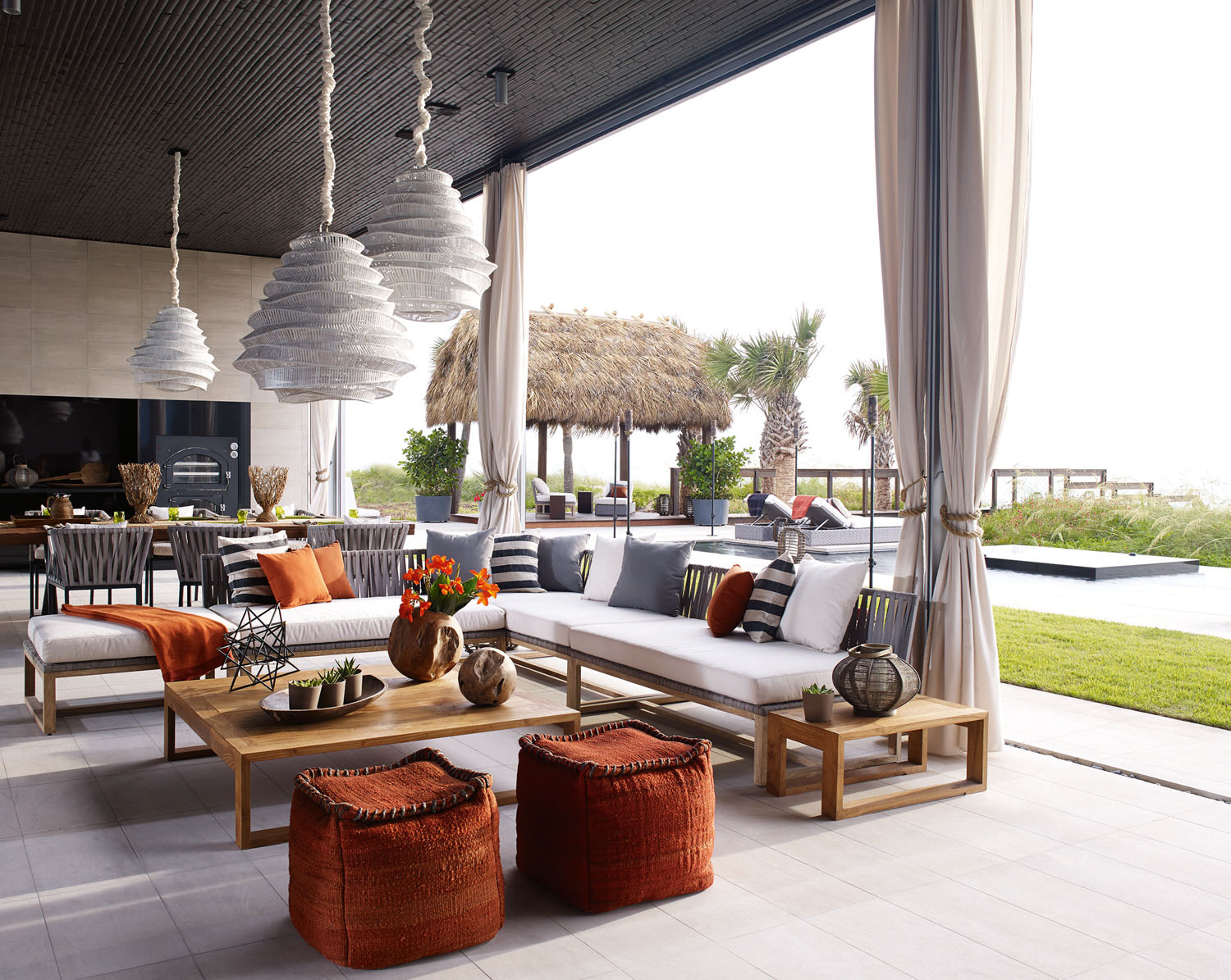 “The lanai/loggia is my favourite space on the property,” says Dorothee. “It’s wonderful to sit here in the sun in the morning, when temperatures are still low, and then it is shaded during the hot afternoon. It offers a comfortable lounge area as well as a dining space adjacent to an indoor/outdoor kitchen. Everyone is drawn to it and whenever visitors are at the house, you’ll find someone enjoying the views and slight breeze off the ocean in the lanai.”