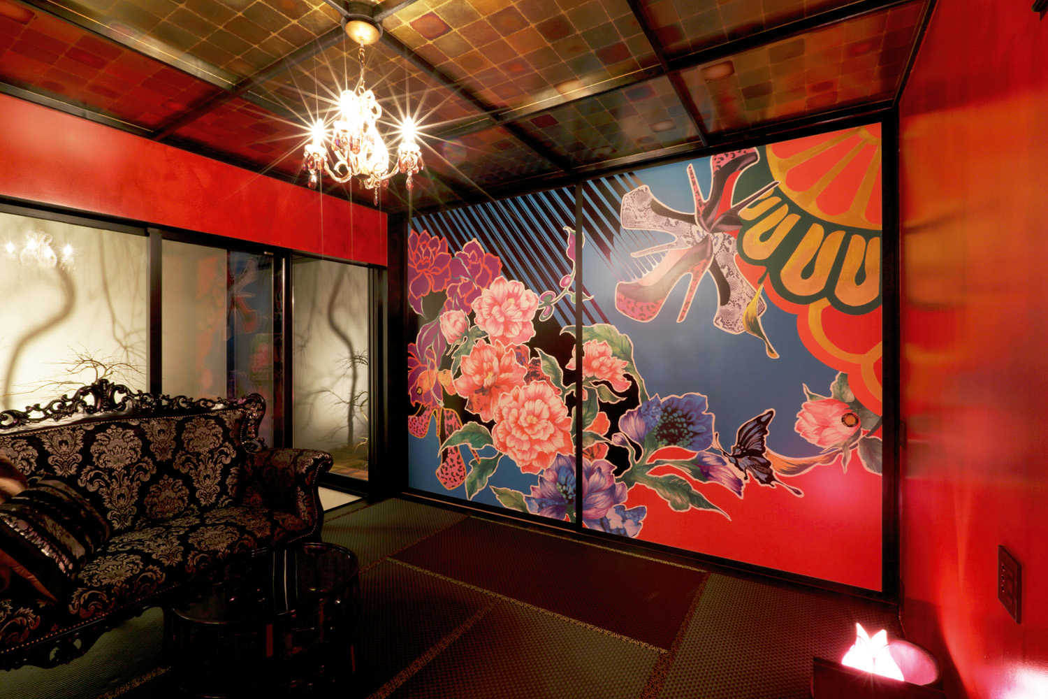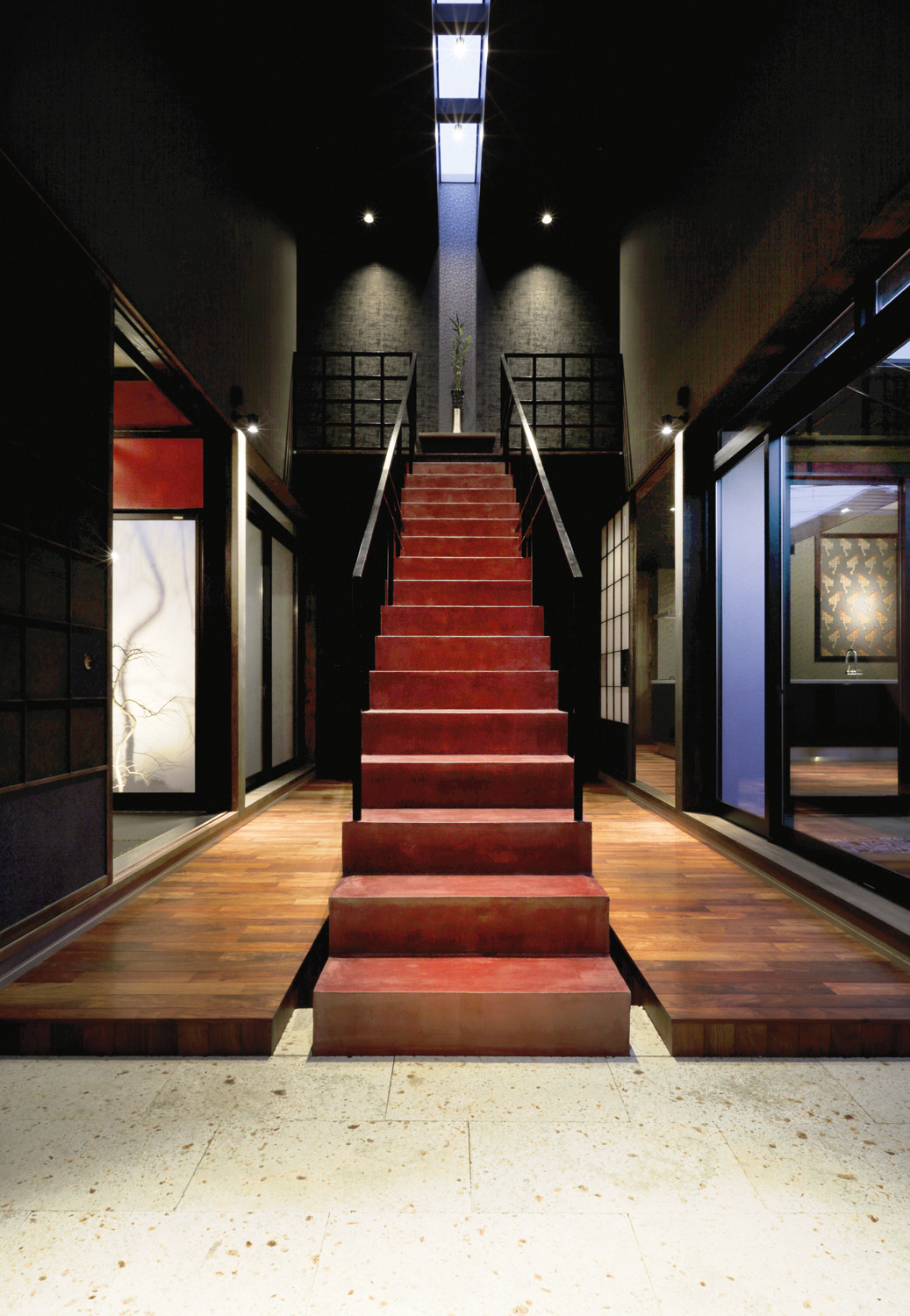 Heading over to the left side of the house is a completely different experience. The colour scheme is bright and modern, with a Japanese aesthetic still present. A washitsu — western-style room — is located on the first floor of the home, featuring a black tatami floor, red feature wall and stunning art piece painted on fusuma (sliding paper panels).