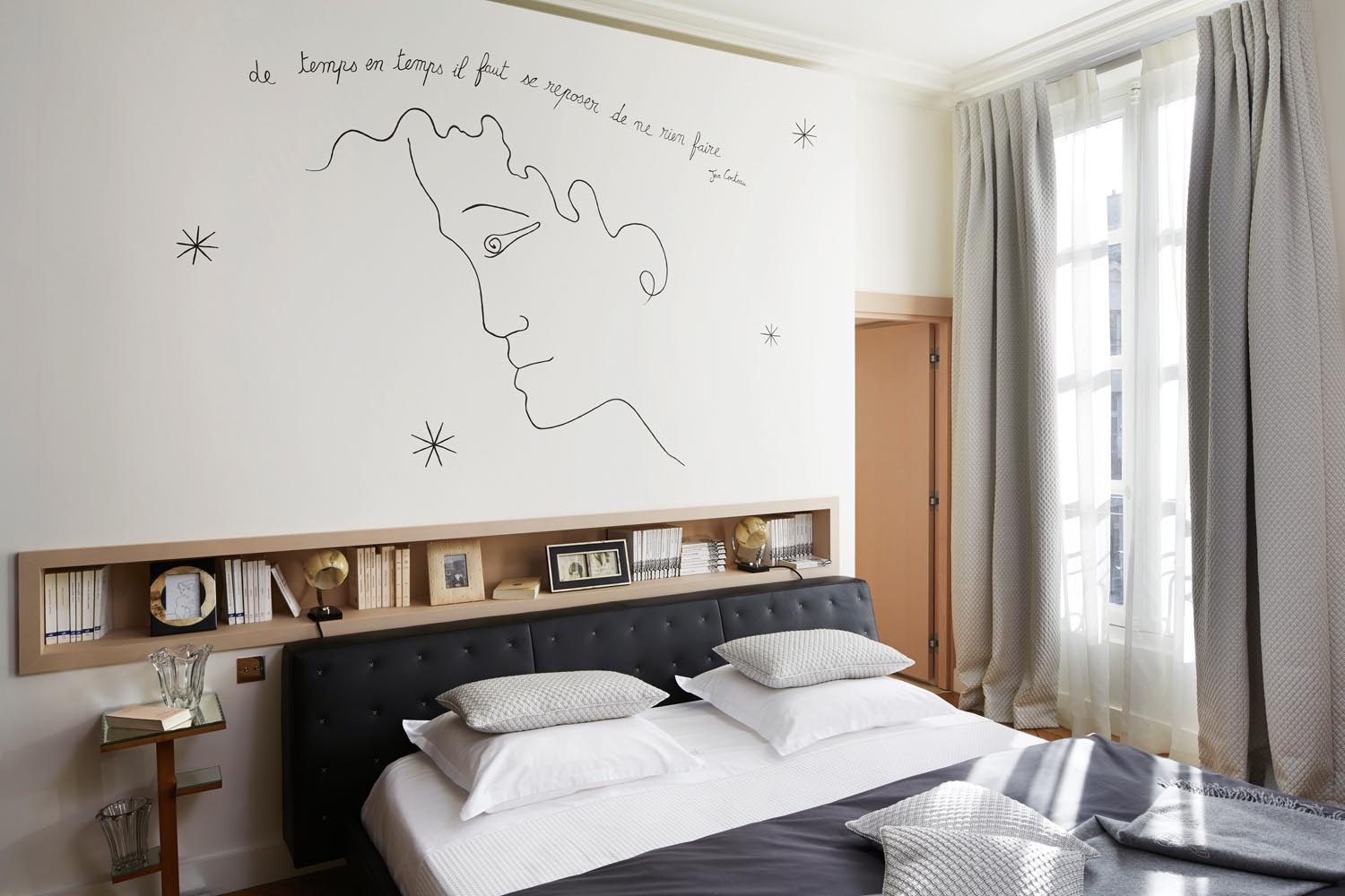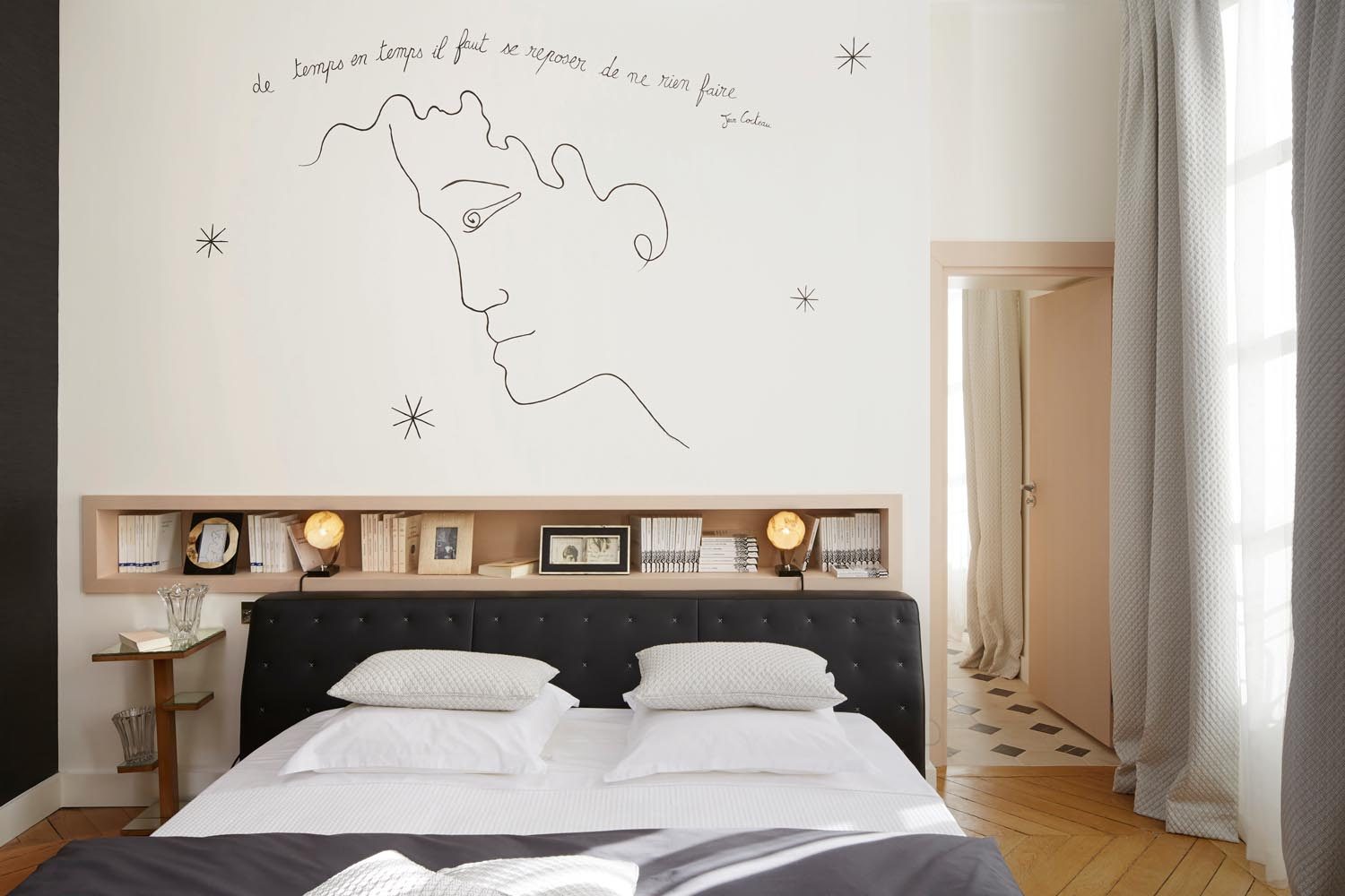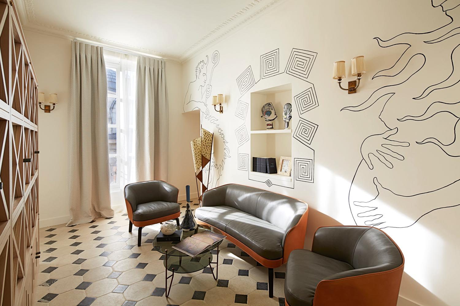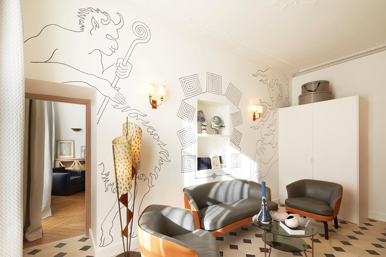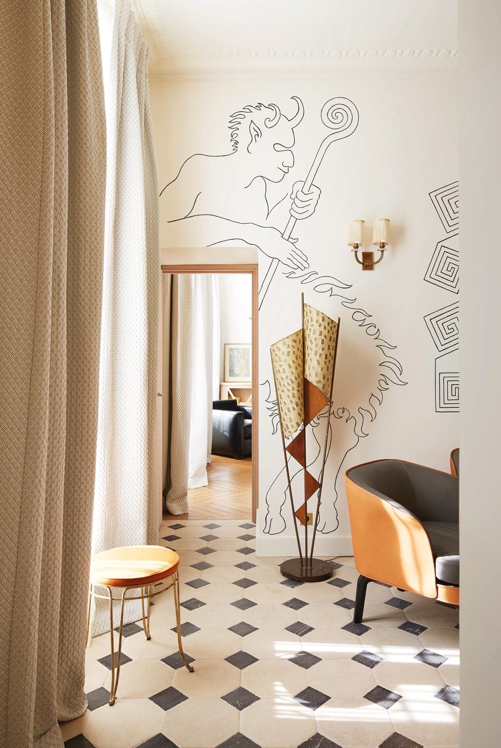 Drawings penned by Xavier Spatafora pay tribute to French writer and designer Jean Cocteau. Adorning the walls of the entrance, the artist’s work is also present on a stark white wall in the second bedroom. The black-and-white flooring of the entrance was recreated to the stylistic codes of the 17th century, consisting of a mixture of aged beige stone and black cabochon stone by Palatino.