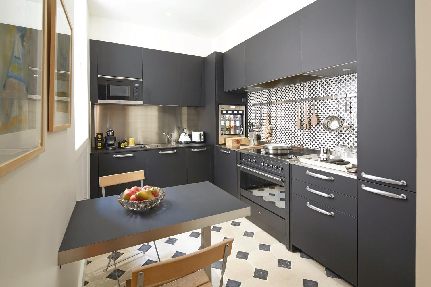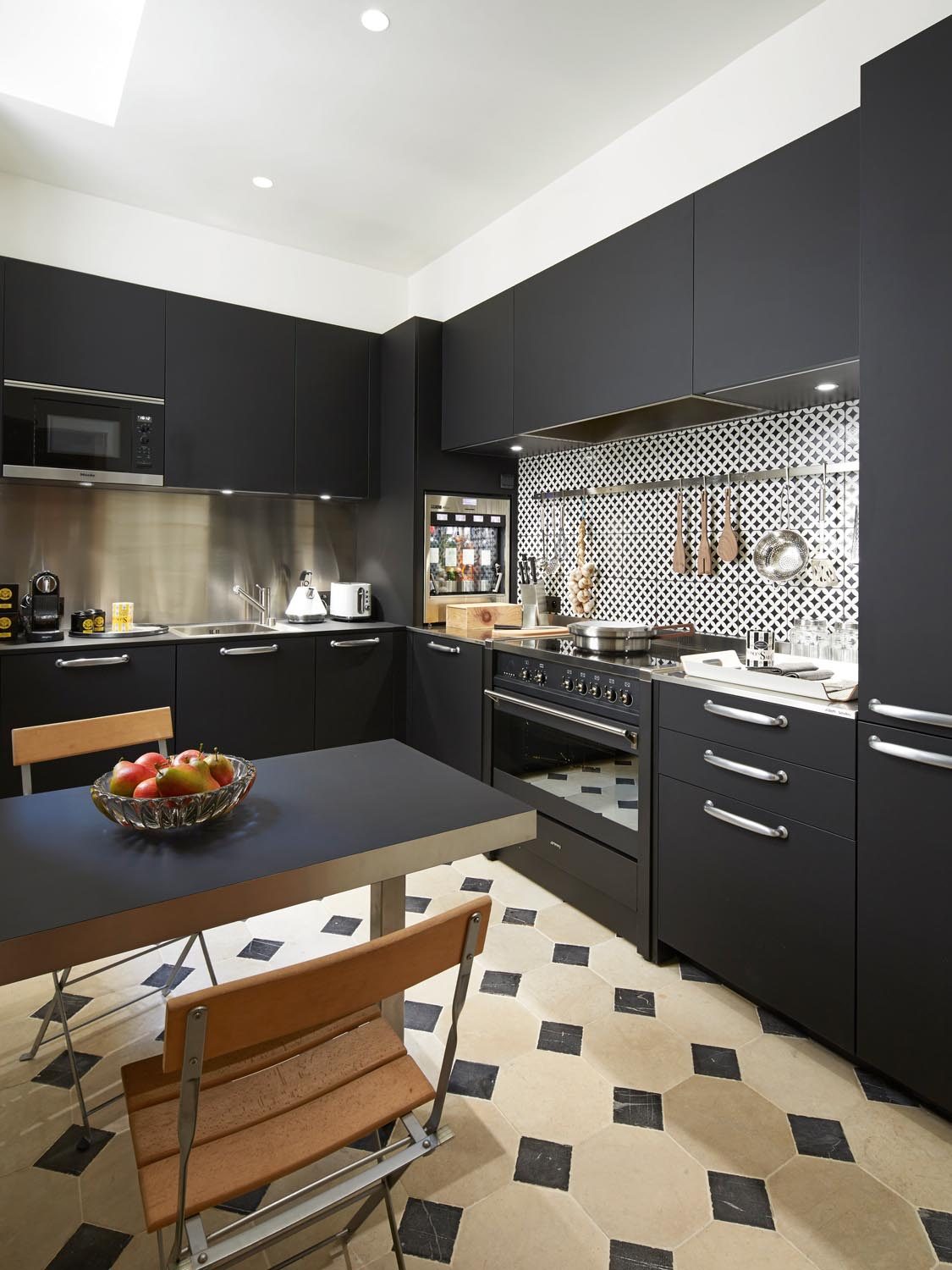 The flooring of the entrance is continued in the kitchen, almost mirroring the ceramic wall between the counter and cabinets that contrast against the black colour scheme of the Boffi Paris kitchen. For an extra Parisian touch, the ever-important Enomatic wine fridge conserves bottles of wine that can conveniently be served by the glass — how very French, indeed.