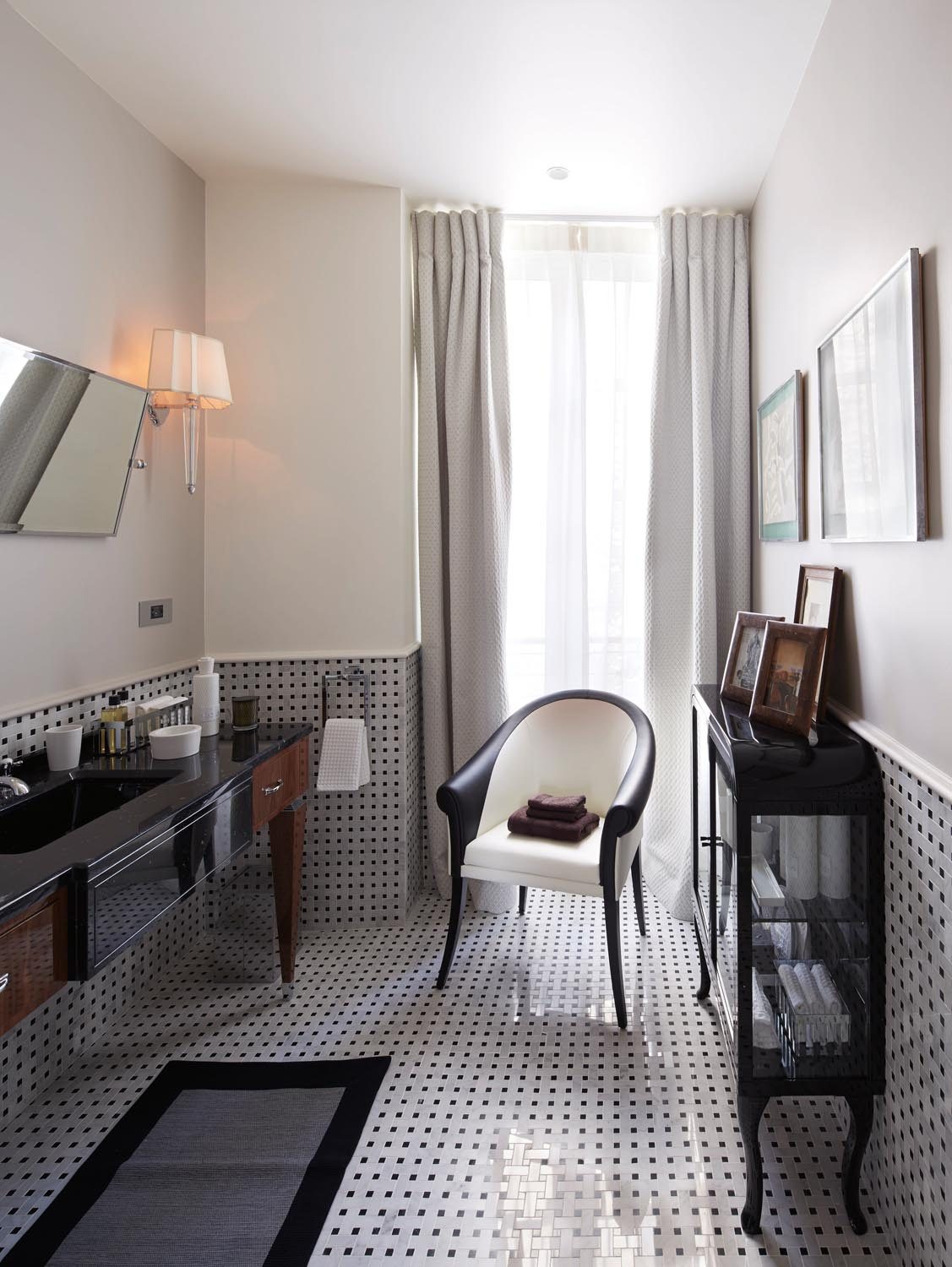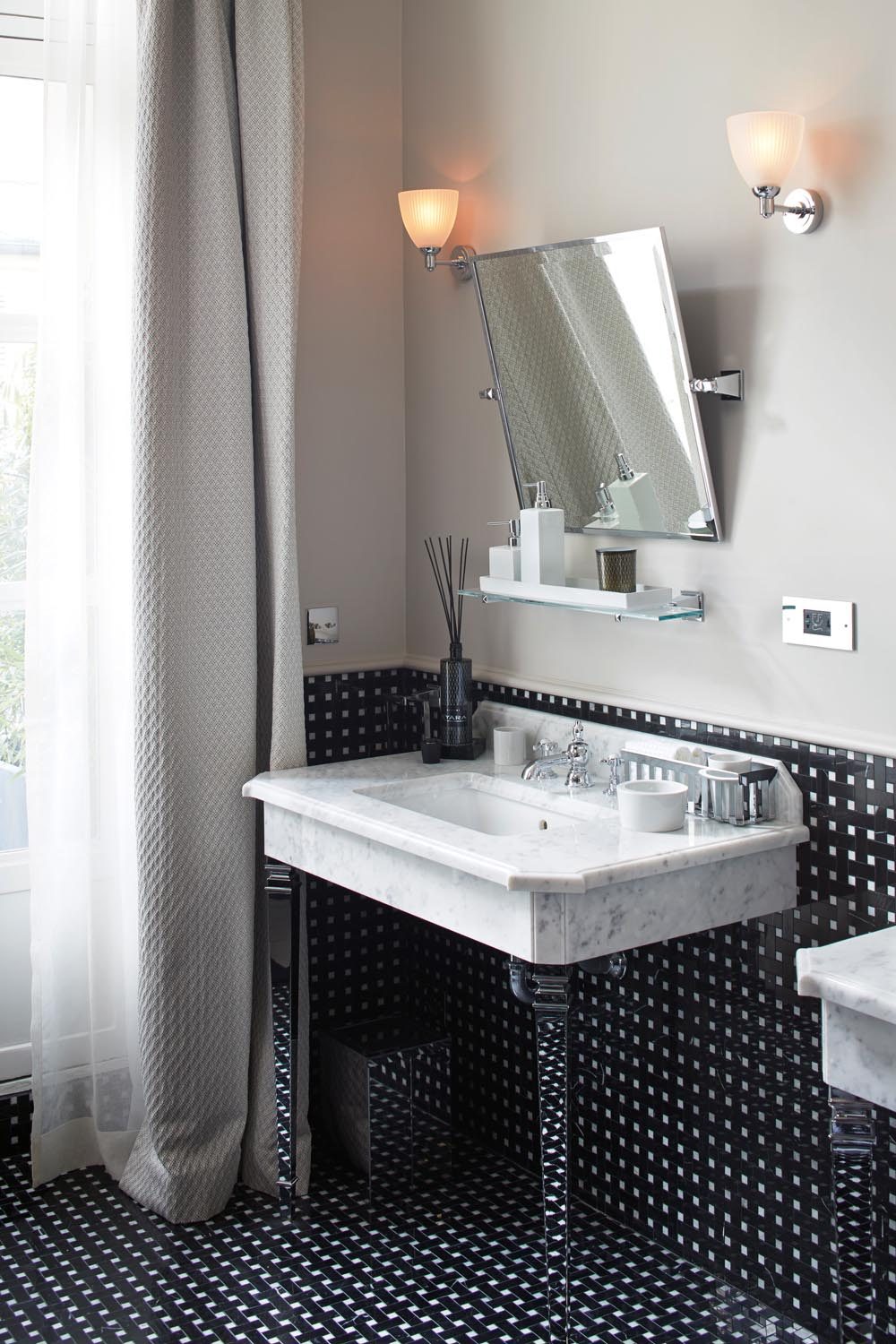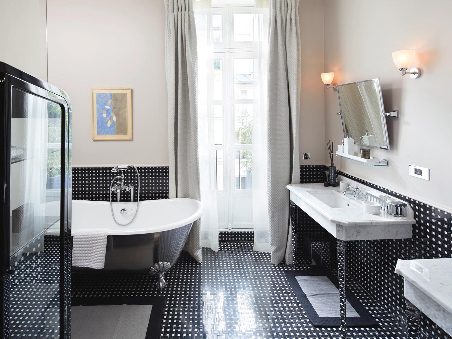 A cast-iron bathtub with polished aluminium feet is the statement piece of the second bathroom. Matching the colour palette of its bedroom, the dark marble floor gleams as the sunlight from the window shines through.