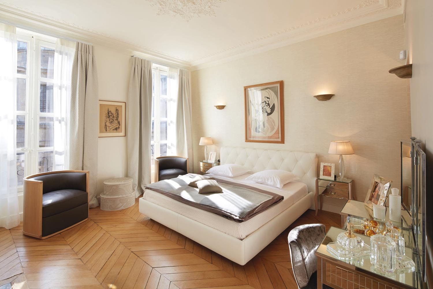 The first bedroom of the apartment is a cocoon of light and natural textures. The white leather bedhead designed by Roberto Lazzeroni for Poltrona Frau blends with the neutral space. Two crystal lamps sourced from antique store Giraud Art Déco add a touch of glamour to an otherwise organic and natural room.
