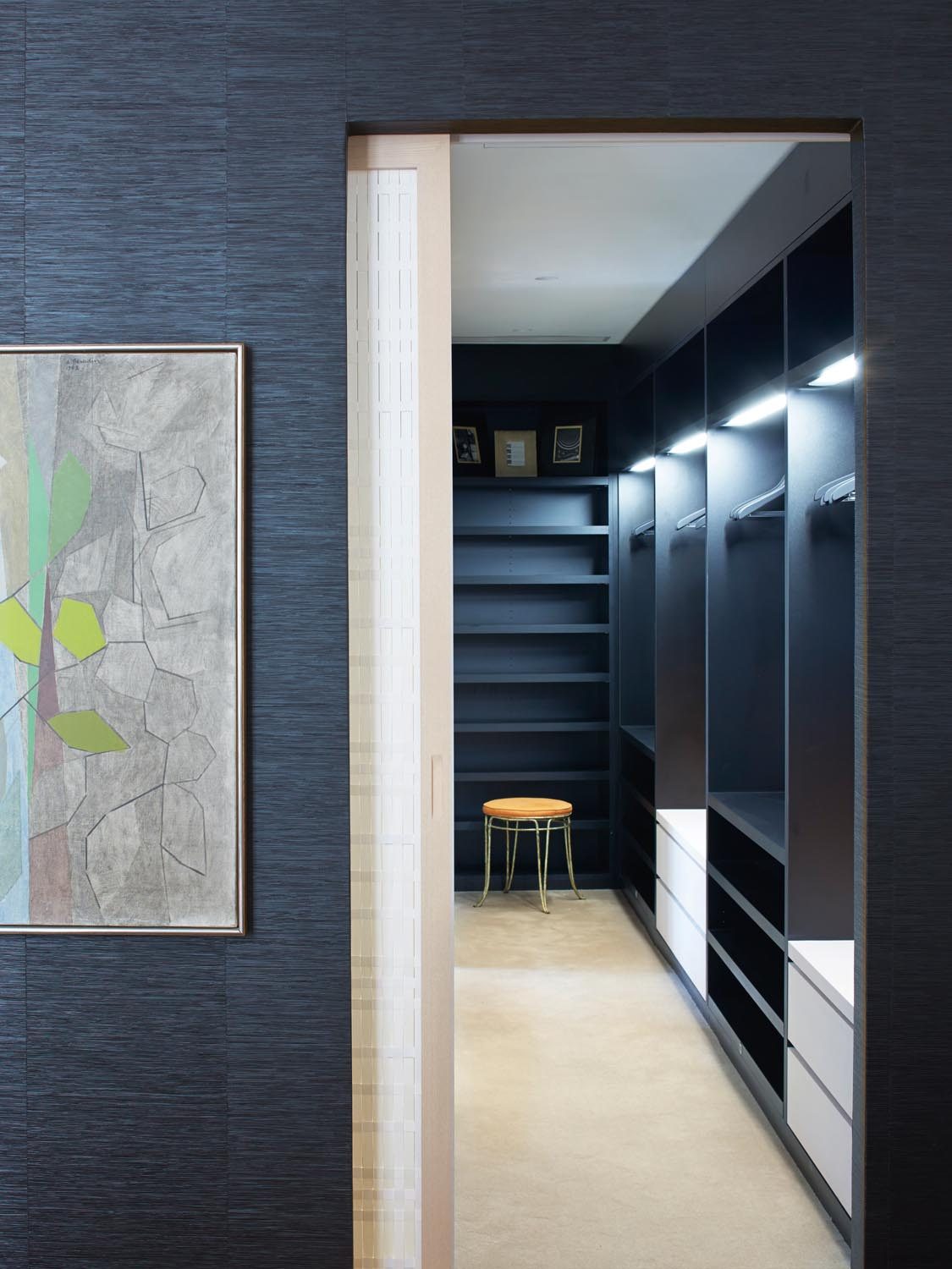 Both dressing rooms are a thoughtful highlight of the structure. Sliding doors in woven Japanese paper were specifically created for Gérard, who also designed the black wardrobes brimming with shelves and hanging space.