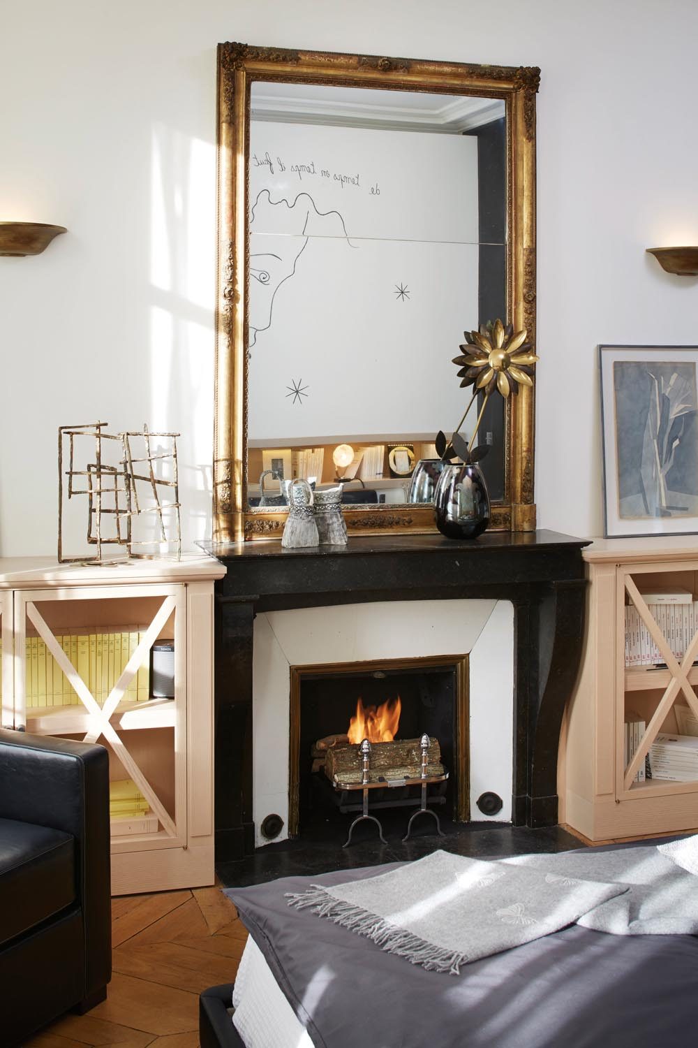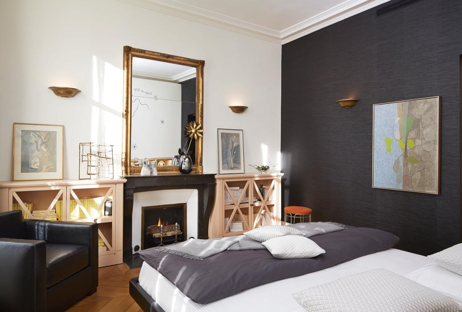 Continuing the earthy feel of the first bedroom, the second features an in-built bookcase and fireplace along with black vinyl wallpaper from Elitis. The moody theme is present in the black leather bedhead and dark purple vases that adorn the fireplace.