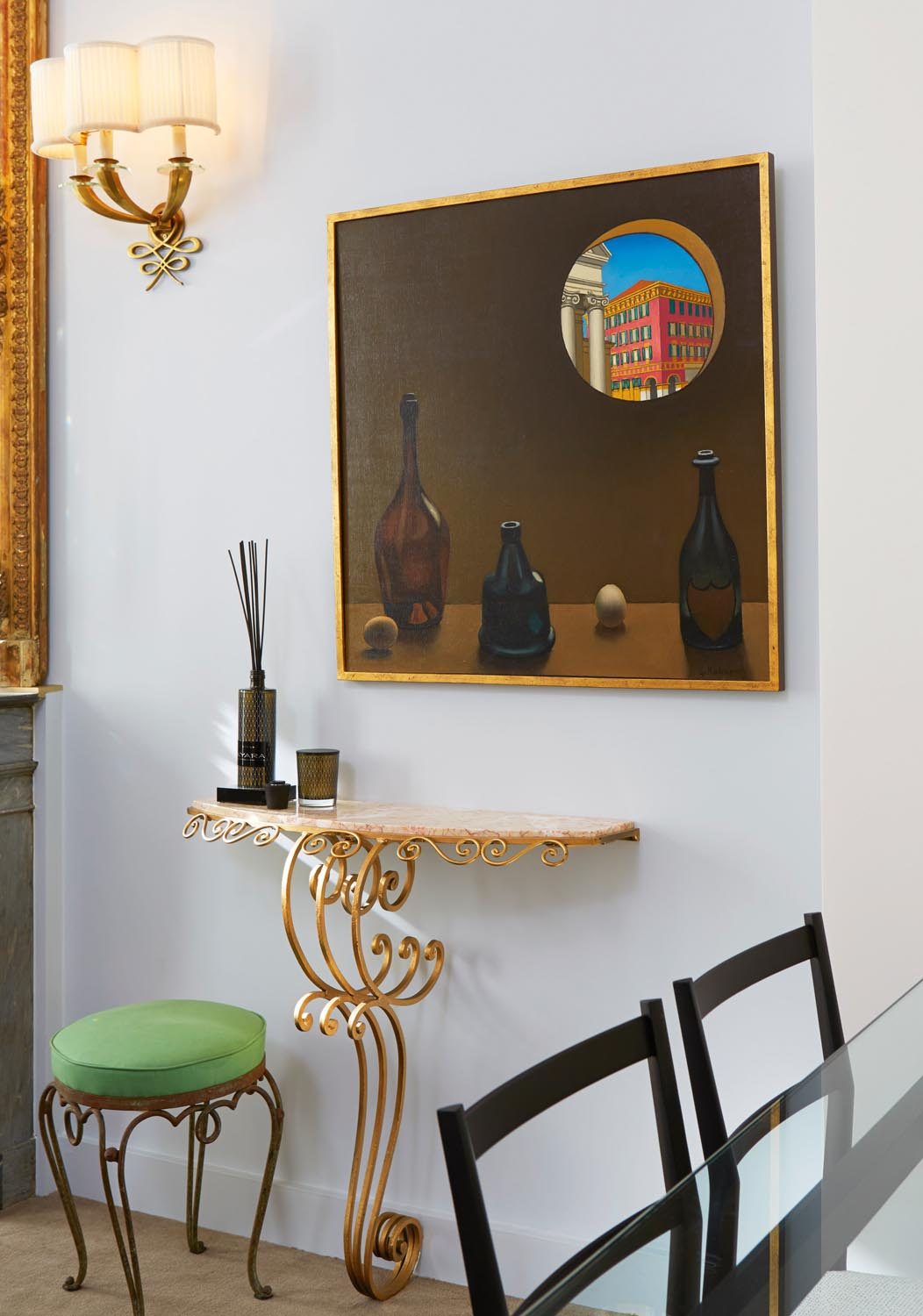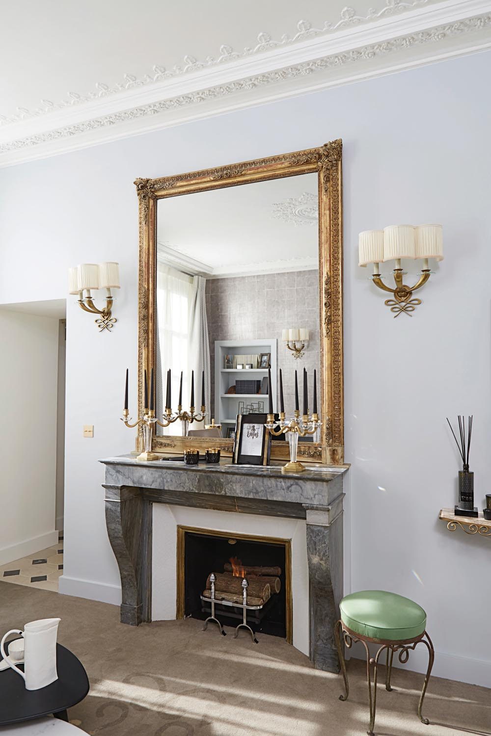 In contrast with the airy nature of the entrance, the dining room’s moody palette is lit by floor-to-ceiling windows framed by pale grey curtains from Ateliers Caffins. Hints of gold are introduced to the space in the form of brass light switches along with a side table by Méret Oppenheim. An ethanol fireplace acts as the centrepiece of the room, decorated by an original mirror and Leleu and Baccarat candle holders sourced from French antique store Trouvaille Antic.
