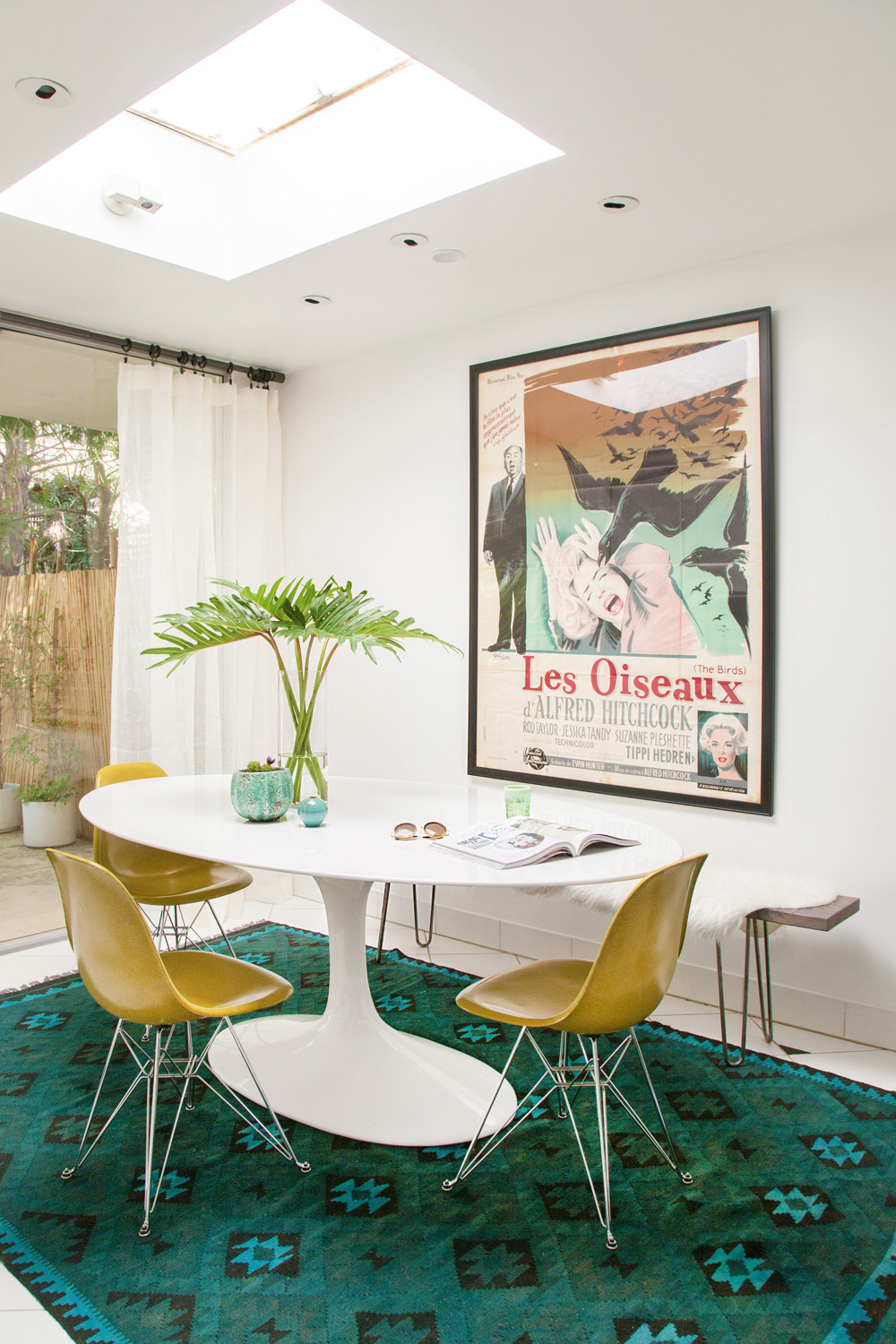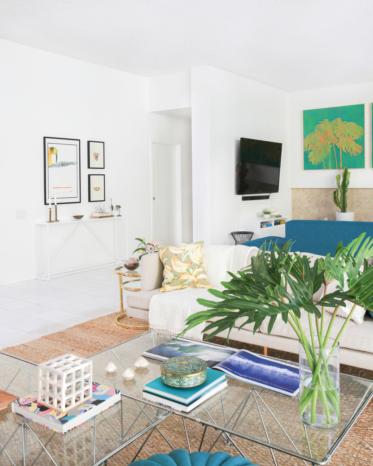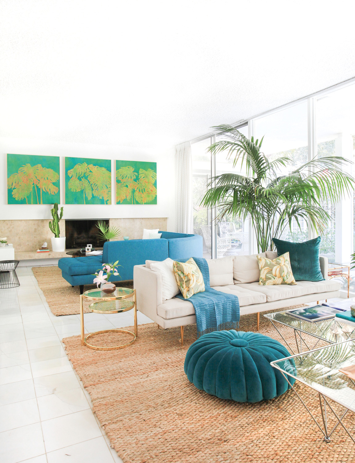 An all-star vintage find is the pouf in the living area, which was reupholstered in a vibrant teal fabric — the perfect piece to create a fabulous Palm Springs look. Greenery is also incorporated into the living area, with plants brought inside to maintain that tropical vibe. “We tried to emphasise tropical vegetation outside by adding some tropical prints and coastal accents, such as sisal rugs.”