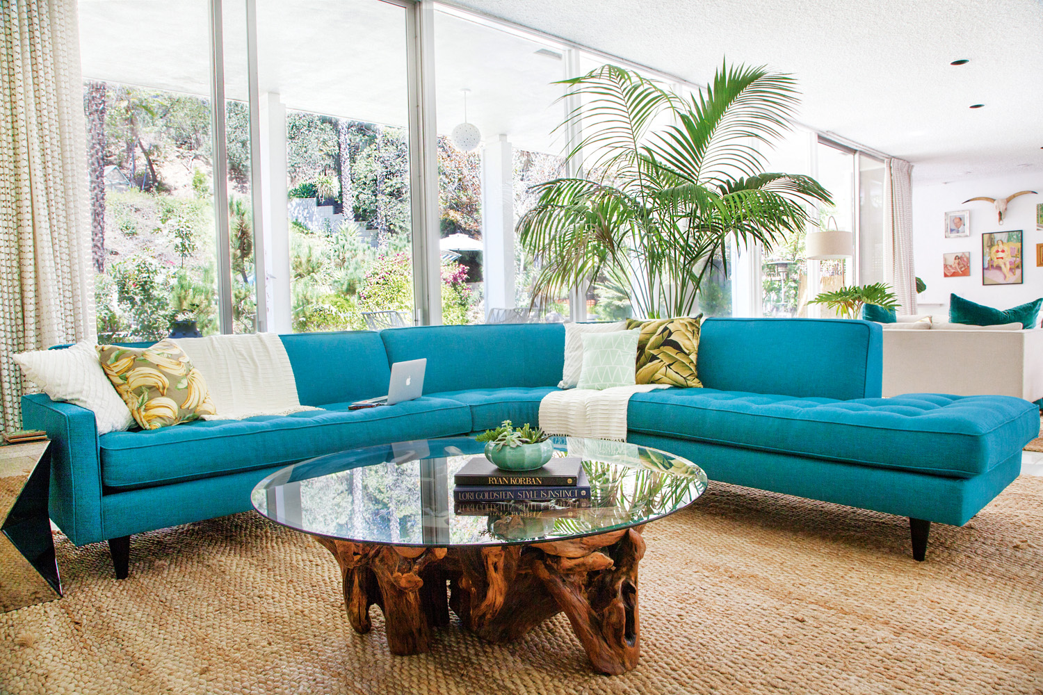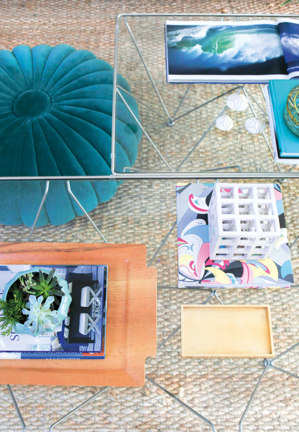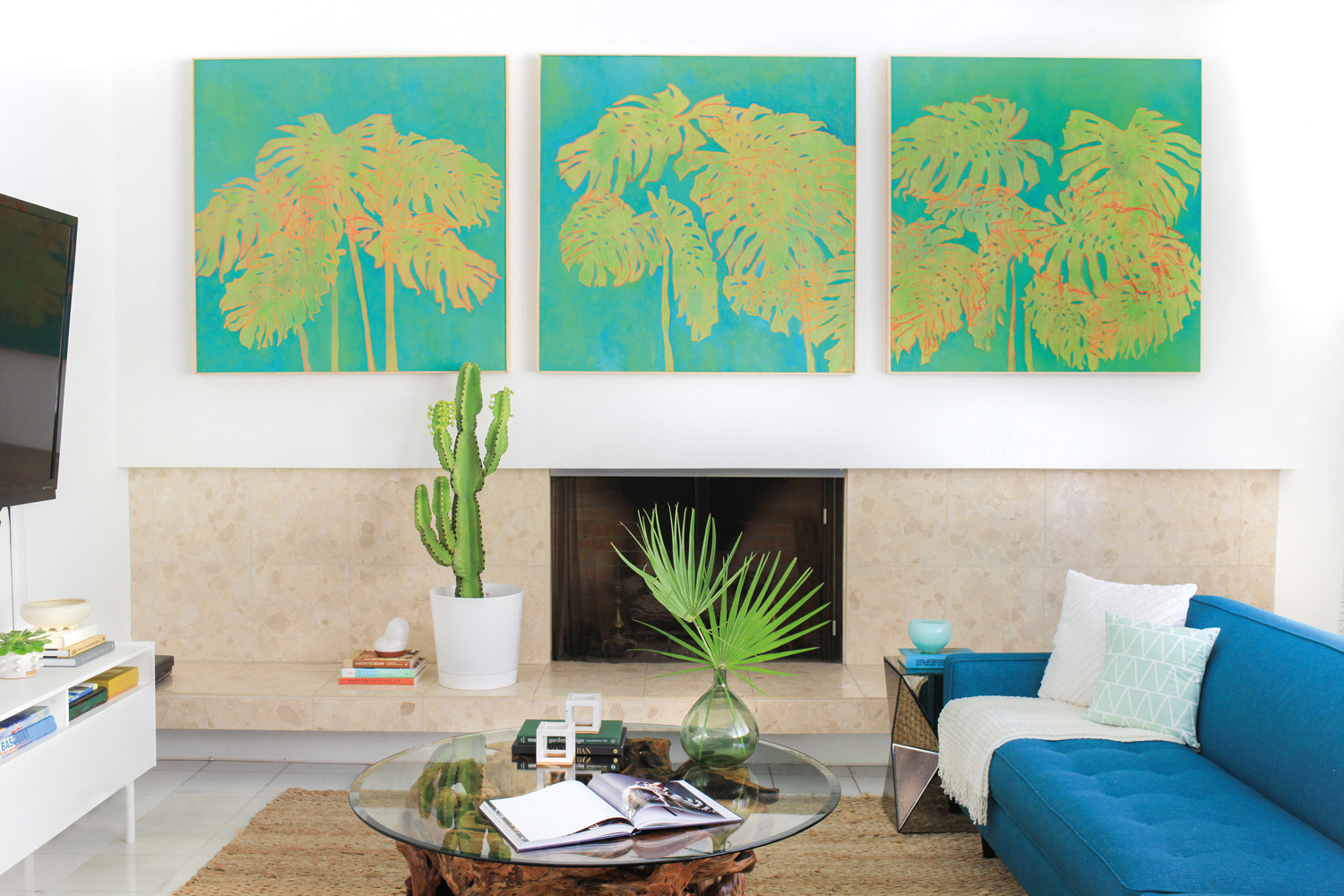 An all-star vintage find is the pouf in the living area, which was reupholstered in a vibrant teal fabric — the perfect piece to create a fabulous Palm Springs look. Greenery is also incorporated into the living area, with plants brought inside to maintain that tropical vibe. “We tried to emphasise tropical vegetation outside by adding some tropical prints and coastal accents, such as sisal rugs.”