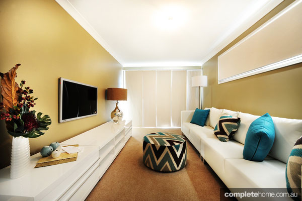 6. The owners have made the most of this long, slim room by installing features that run the length of it. The sleek, polished white cabinet matches perfectly the white, contemporary couch directly opposite. Mustard walls add warmth and are beautifully complemented by the vibrant teal and bold patterns of the cushions and footstool.
