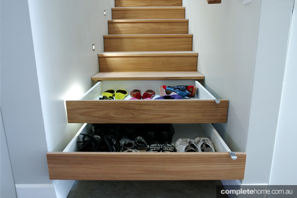 Under treads: Always a goldmine when it comes to storage, there are a wide range of pull-outs ranging from standard drawers to shoe or wine storage. Although this is an excellent form of concealed storage, it needs to be incorporated into the stair design.