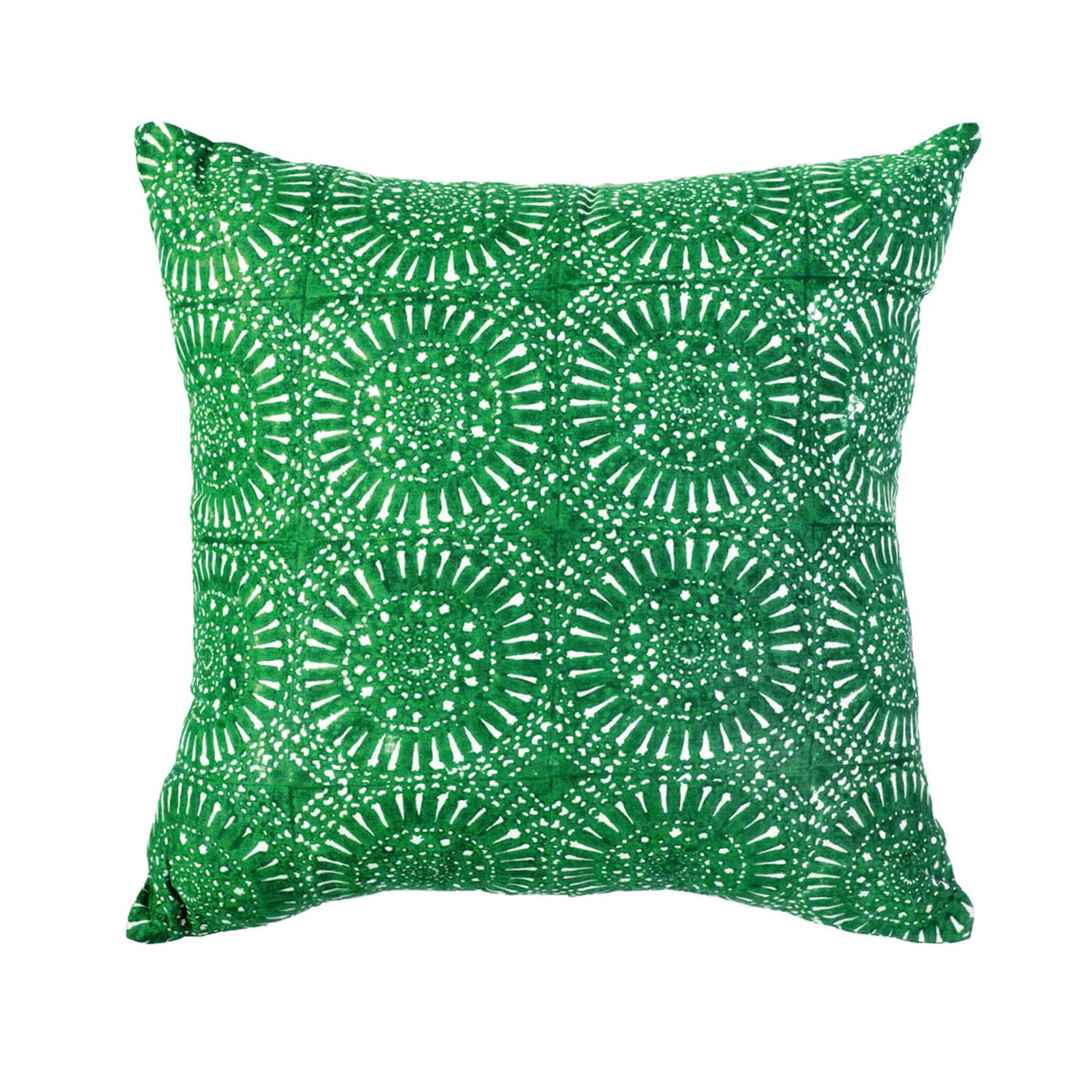 The Sphere silk cushion by Bandhini features an emerald block print on paper silk. Each cushion comes with cruelty-free feather inserts that are by-products of the poultry industry. Available at Eco Chic.