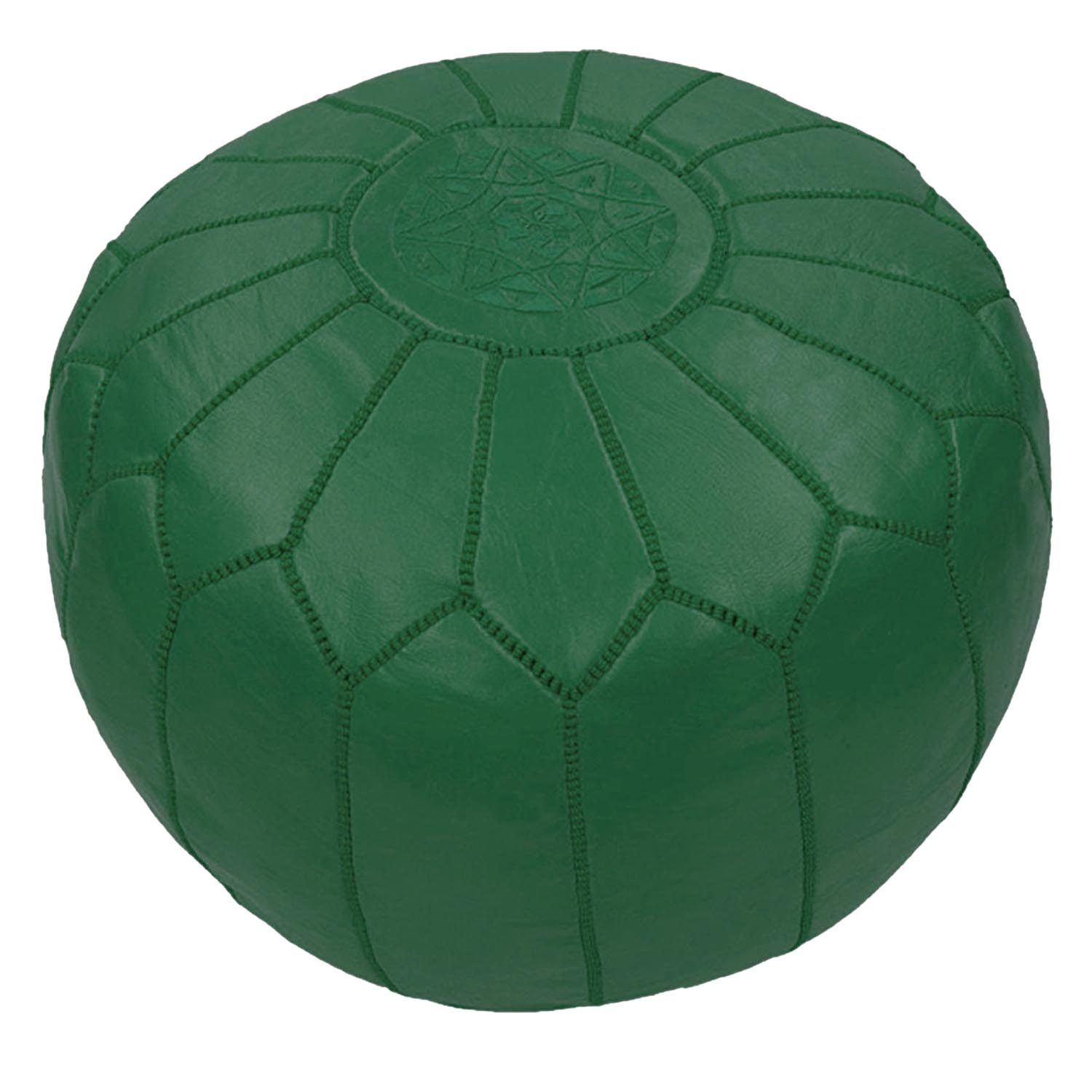 The Moroccan green leather ottoman pouf from ROCK RIBBONS features silk-reinforced stitching and a star detail. Constructed of goat’s skin, each leather pouf is handmade by artisans in Morocco and ethically purchased using fair trade arrangements.