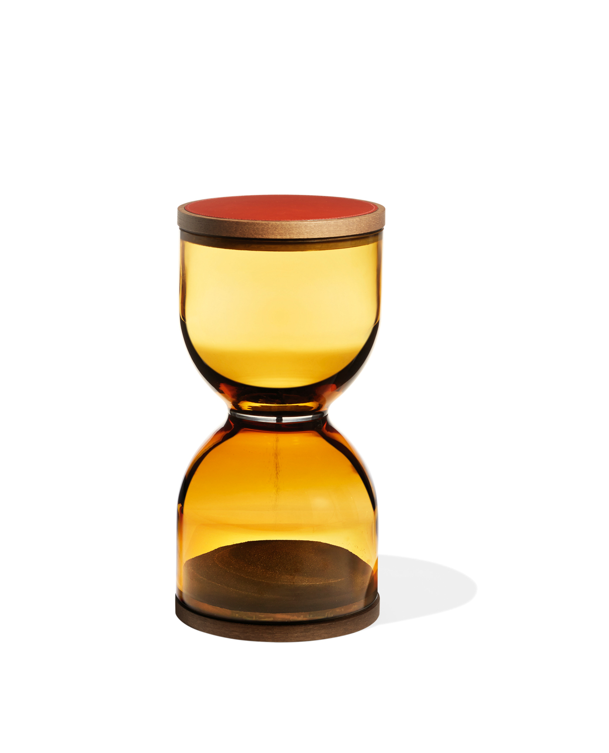 The Les Sables du Temps sculpture by Elliott Barnes features a coloured glass-blown frame and stained chestnut and topstitched leather seat and base. ebinteriors.com