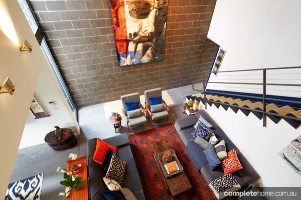 The first floor houses the Brooke Aitken Design office, where Brooke works with her three colleagues. The second level is split, with a large void over the living area, and the two levels are joined by what Brooke refers to as “the bridge”. The front of the second level houses a spare bedroom behind the balcony, while the back is home to their son’s bedroom, bathroom and his own personal balcony. The front and the back can be closed off with sliding doors. “These doors are invaluable,” Brooke says, “as they seal off the living area acoustics. We can be watching loud TV in the living room and our son is undisturbed in his bedroom.”