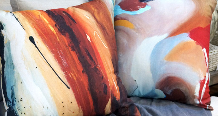 With an imaginative spirit permeating her DNA, Chloe has always had the urge to create. “The desire to keep painting and creating things for other people became such a fulfilling feeling that I thought, ‘Wouldn’t this be great to do full time,’” says Chloe. Describing her design style as “organic”, she expanded her business by designing a range of furnishings that would flow on from the canvas. Just in time too, as we are seeing a growing trend in the desire for unique prints and the need for a way to inject some colour into the commonly-seen minimal space. “I take high-resolution images of close-up sections of my paintings and send them to different factories in China and India where they are made into placements, printed canvases and cushions. I design the specifications here so there is no room for error with proportions and layouts,” says Chloe.