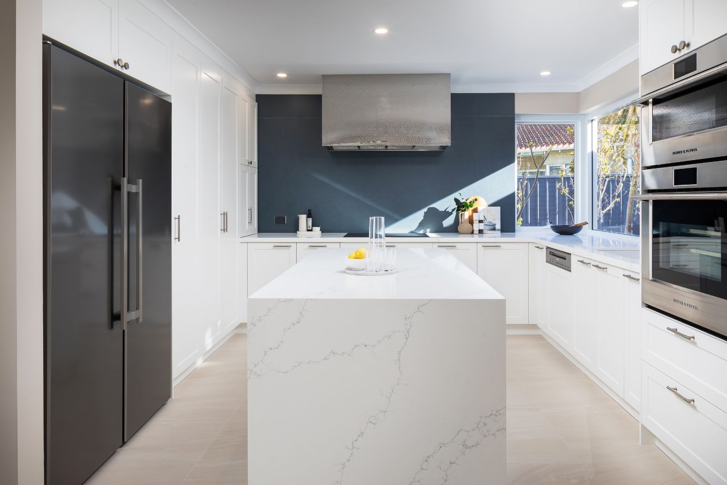 At its centre is a custom-patterned shroud by Qasair Rangehoods, bringing a sense of individuality and craftsmanship. The cabinetry was finished with handles featuring subtle embossing, a detail that rewards closer inspection. Benchtops with intricate blue veining add another layer of refinement and continuity, tying back to the porcelain surfaces. The result is a kitchen that feels prestigious and robust, designed for a client who loves to cook and entertain.