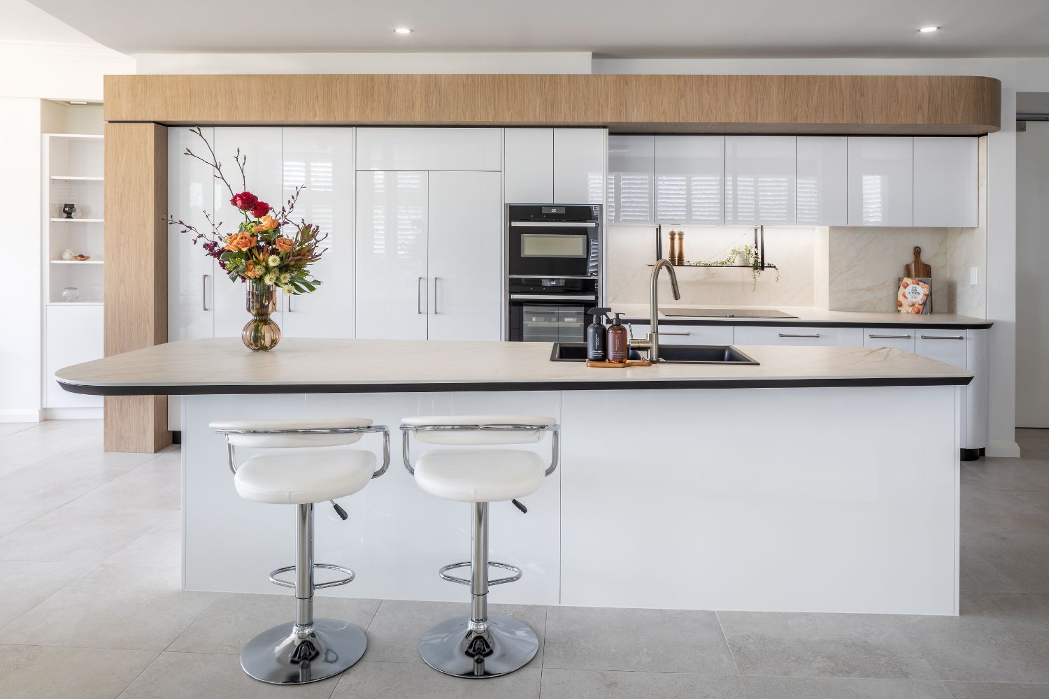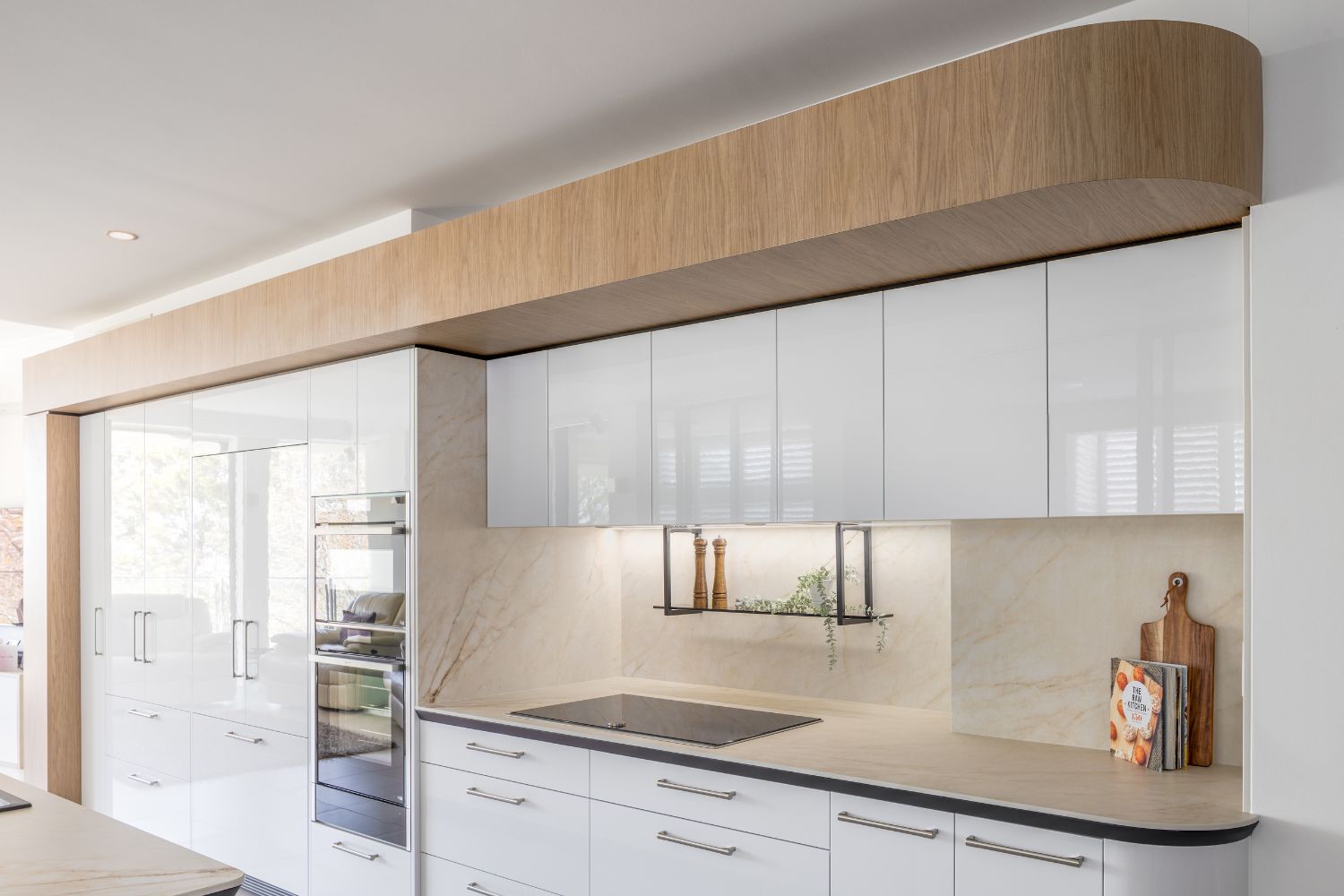 The design took advantage of the newly created depth, introducing a functional cooking zone complemented by a decorative shelf. Materiality became a defining feature, with Vasari porcelain bringing warmth and luxury, set against a black bevelled substrate. This interplay created elegant curves that visually echo the overhead bulkhead, achieving a sense of balance in the unusual space. Every angle offers something intriguing, ensuring the kitchen remains both practical and visually engaging.