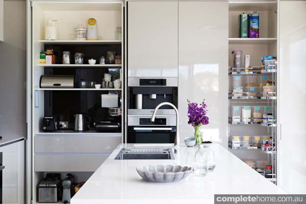 Designed by Michelle Hosking for Quattro Architecture, we love the large island bench, hidden appliance cupboard, pull-out pantry unit and wrap-around full-height storage extending from the kitchen into the dining area.