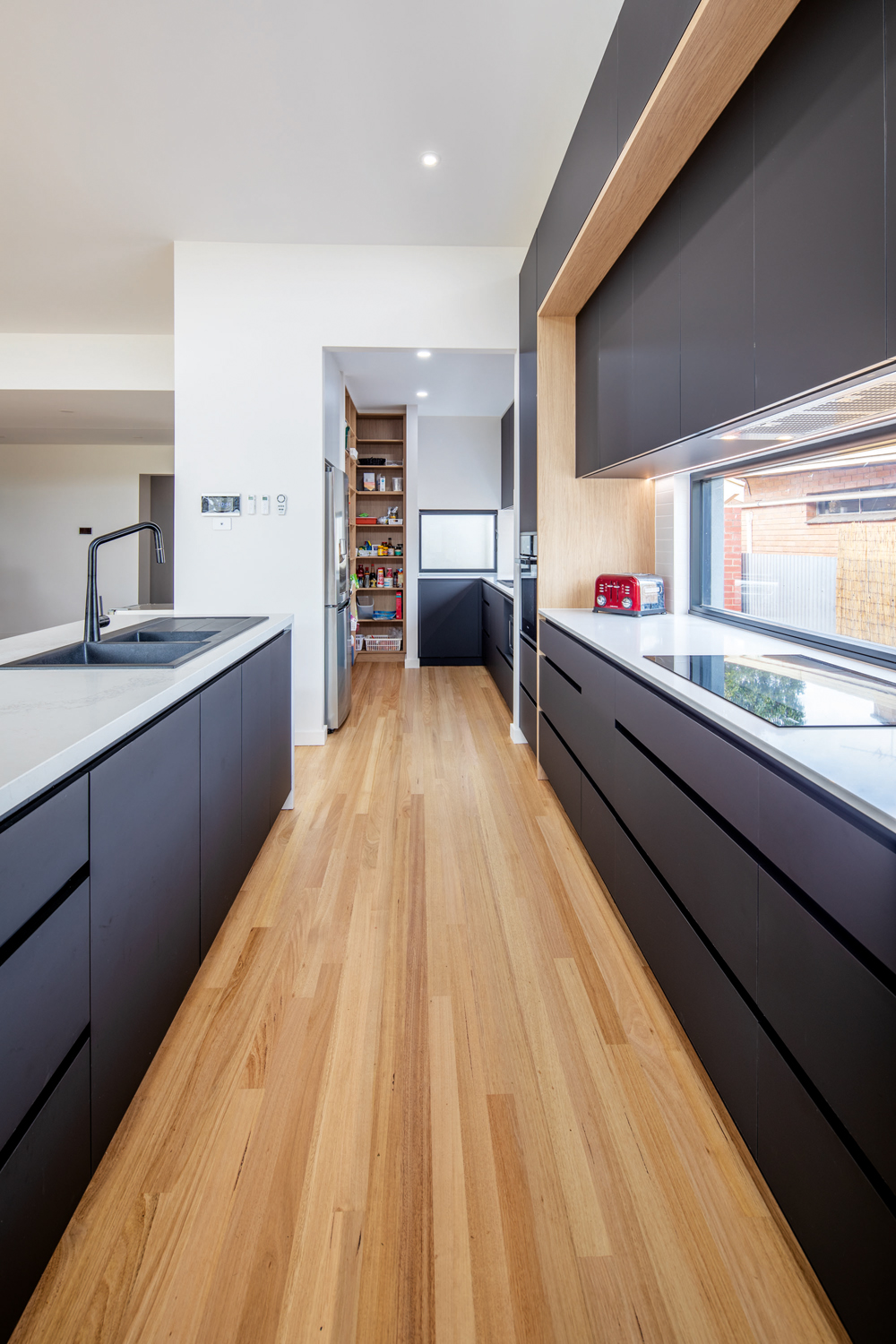 The light floors and Caesarstone in Snow and Calacatta Nuvo soften the dark joinery. The feature timber in the kitchen is Polytec Boston Oak in Woodmatt finish.