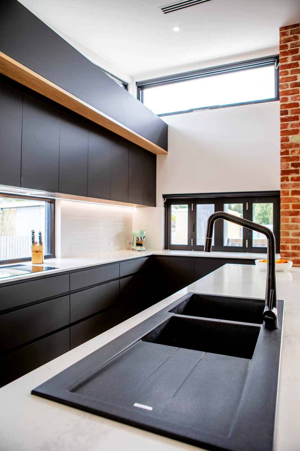 A bold and beautiful contemporary kitchen renovation boasts clean lines. The monochrome look is offset by the contrasting warm timber. The kitchen is spacious and generously appointed, designed to have a direct connection to new living areas and alfresco areas.
