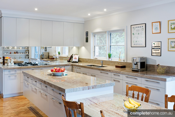 “These clients wanted a modern and practical kitchen that would allow for lots of through traffic in the kitchen and then flow onto the meals area and outdoor living space. The existing kitchen was a U shape with a separate meals area. This provided lots of congestion. The solution we created was an island bench with integrated table, allowing plenty of through traffic and an abundance of workable bench space. To complement this we made a matching dresser at the end of room. The design was to allow maximum use of drawers, in particular the island was double-sided drawers on top of large mirrored kicker drawers. The mirrored kickers give a nice floating look with the additional height, making the kick drawers practical. Two-pack cabinets add a quality feel, combined with granite benchtops, enhanced by the mirrored splashback behind the cooktop. The mirrored splashback also allows the cook to see what is happening behind them and admire the outside garden.”