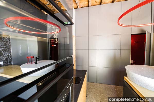 The wet area is integrated into the top of the bar and the black accents in the Mosaic Dalmatian colour are highlighted by the complementary matte black kitchen mixer. The kitchen features integrated appliances, and a series of five VZug appliances, which form a mirrored cube.