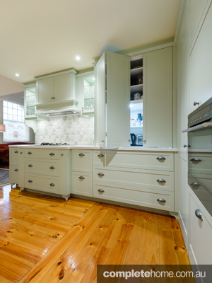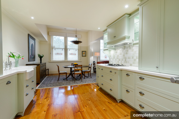 “The inspiration for the design and colour scheme is the Arts and Crafts movement of the late 1800s to early 1900s, when the house was built. It’s all about traditional craftsmanship and romantic decoration, with pale greens featuring heavily. We’ve recreated that craftsmanship that is seldom seen these days with features such as the decorative mouldings, curved edges, Shaker-style cabinets and tongue and groove panels. Other authentic elements include the traditional handles, butler-style sink and celadon tiled splashback. Behind the older-style façade, however, is a very functional, modern kitchen, which makes the most of limited space. It was important to the client to have designated areas for two people to work in comfortably as well as an open-plan style to connect to the living and dining area and a combination of mood and task lighting. Every cabinet was designed with a specific purpose in mind and every nook and cranny is useable storage thanks to good use of internal hardware such as pull-out shelving, bi-fold doors and lift-up doors. There’s even a U-shaped drawer under the sink that wraps around the plumbing.”
