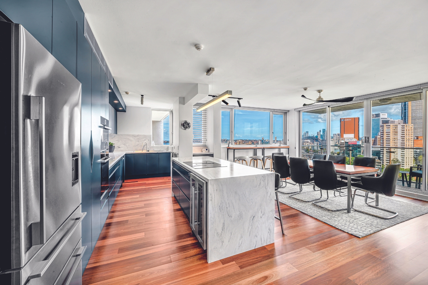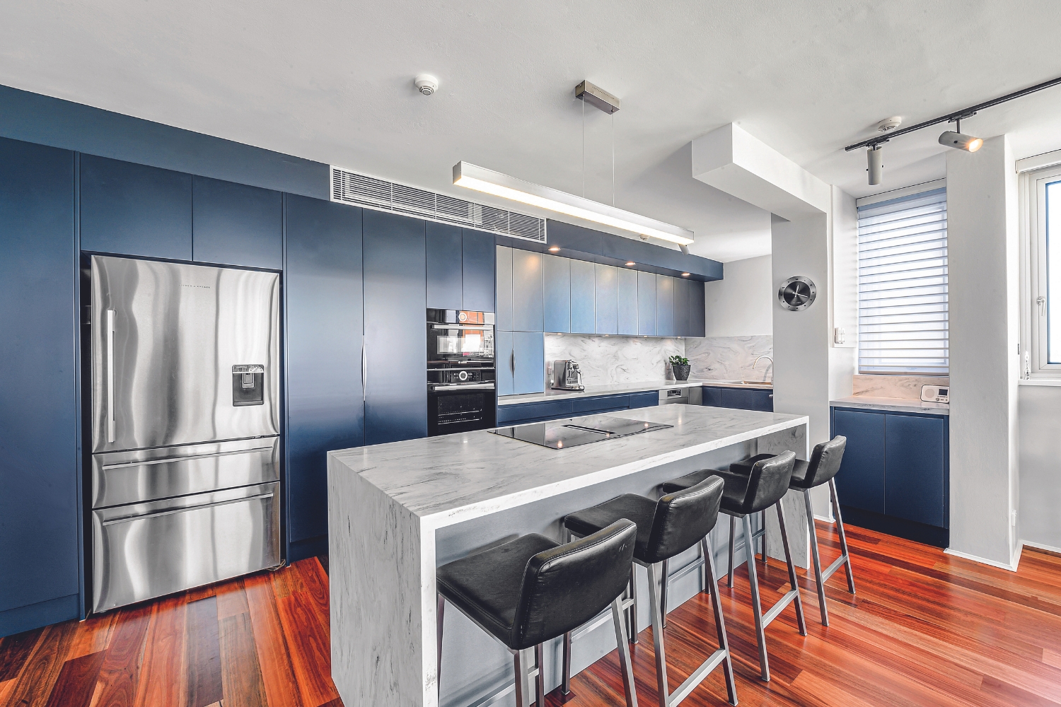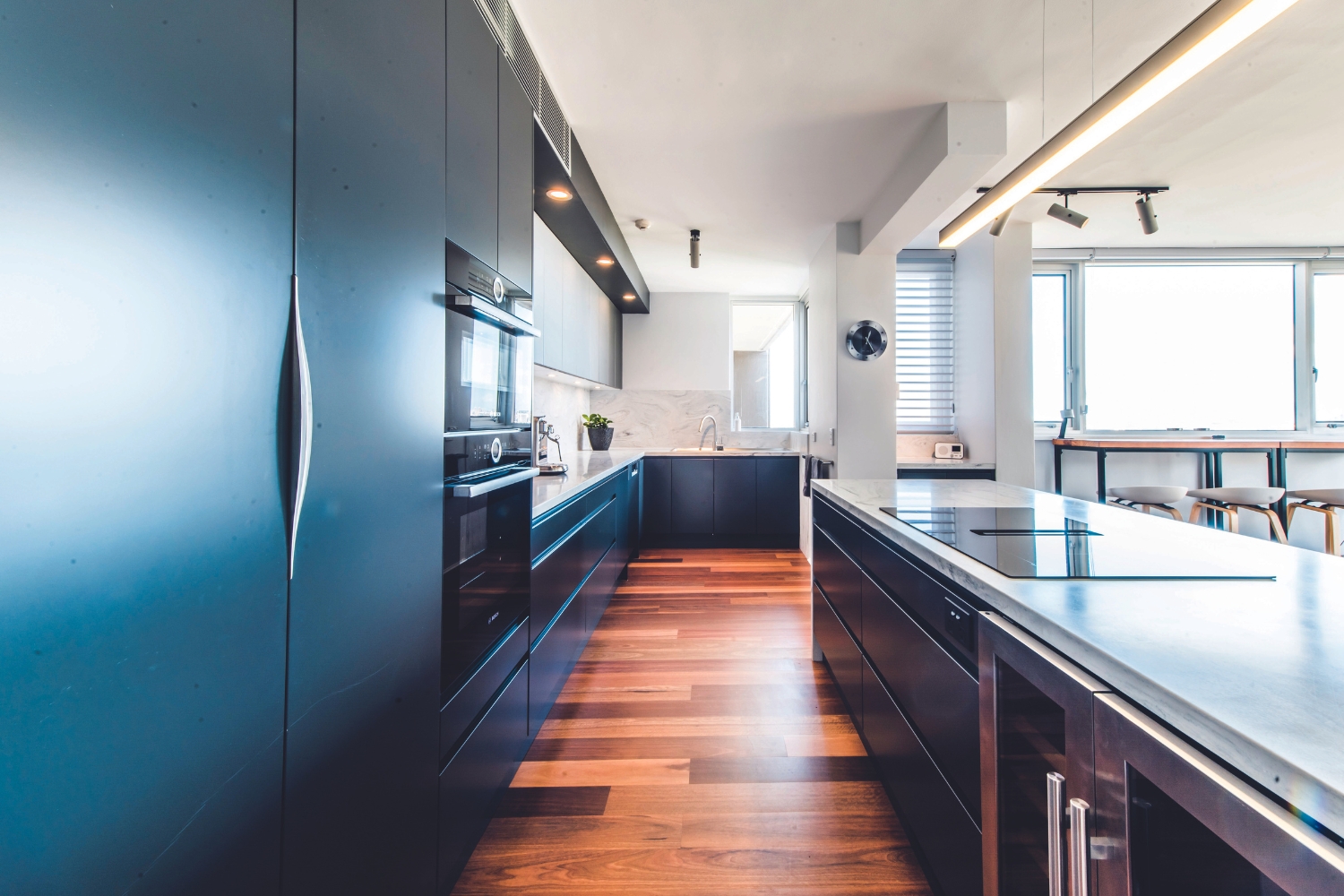 The Corian Carrara lino splashback picks up slivers of grey and works handsomely with the colour tones of the rest of the kitchen, and with warm timber flooring underfoot, it balances the cool colours in the space.