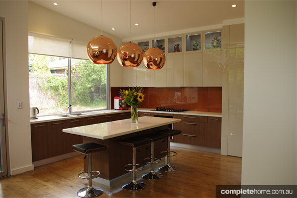 “This architect-designed home features a high raked ceiling over the kitchen, which gave us the opportunity to locate the owners’ pendant lights as the centrepiece above the island bench. The owners are well travelled and it was important to show a few artful objects that they had collected. The pendants were found during their holiday in London and inspired the choice of warm timbers and the burnt orange glass splashback, which has pockets of concealed storage at both sides of the cooktop. Bi-fold panels provide easy access to hidden appliances and the tall cupboard doors conceal stairs that lead down to the cellar below the kitchen. We designed as much symmetry into the joinery as possible and placed lighting in strategic locations. LED strip lighting illuminates the display cupboards and the island bench appears to float.”
