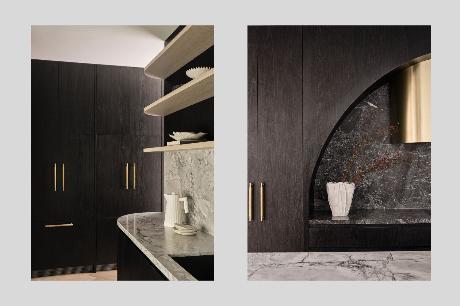 The cabinetry, finished in dark-stained timber veneer from Elton Group, anchors the room in rich tonal contrast. Full-height joinery conceals ample storage, maintaining a pared-back aesthetic that allows the kitchen’s architectural gestures to take precedence. This refined approach ensures the space feels luxuriously minimal rather than utilitarian, aligning with the client’s request for a design that reads as a statement piece.