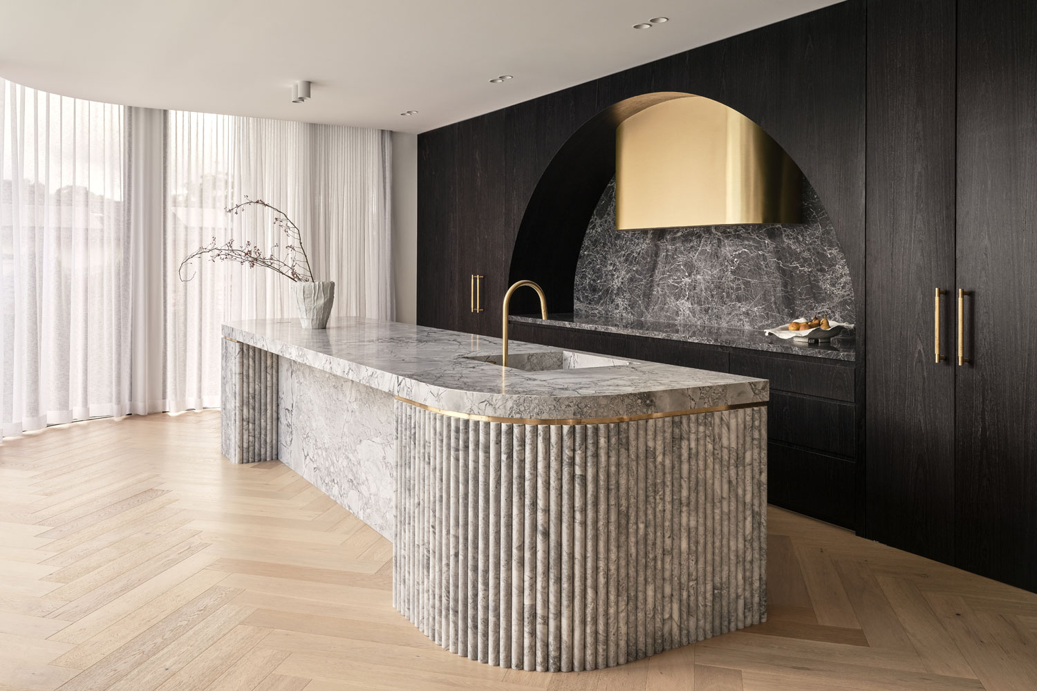 The finished result is a luxurious and contemporary kitchen that exceeds the brief, marrying bold materials and sculptural gestures with an unwavering commitment to livable design.