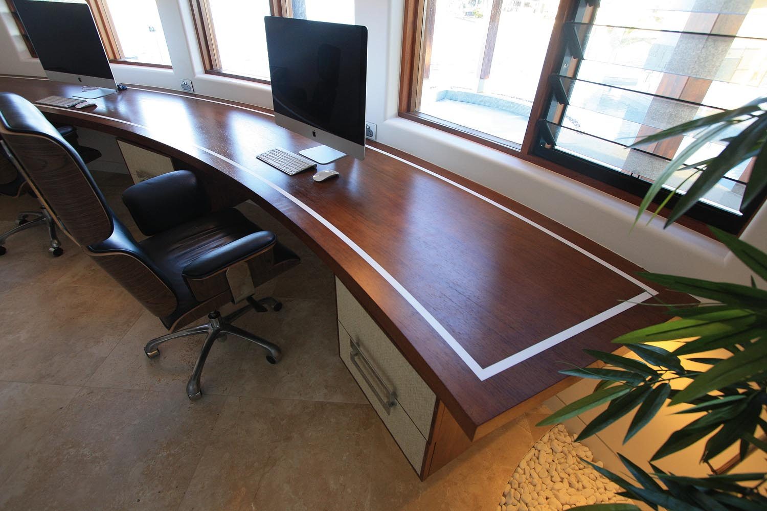 In the office, the curved desk inlays in Corian® Rice Paper accentuate the beautiful organic lines of the rosewood desktop and flow harmoniously into the lower floor joinery, visually connecting the desk to the travertine marble floor.