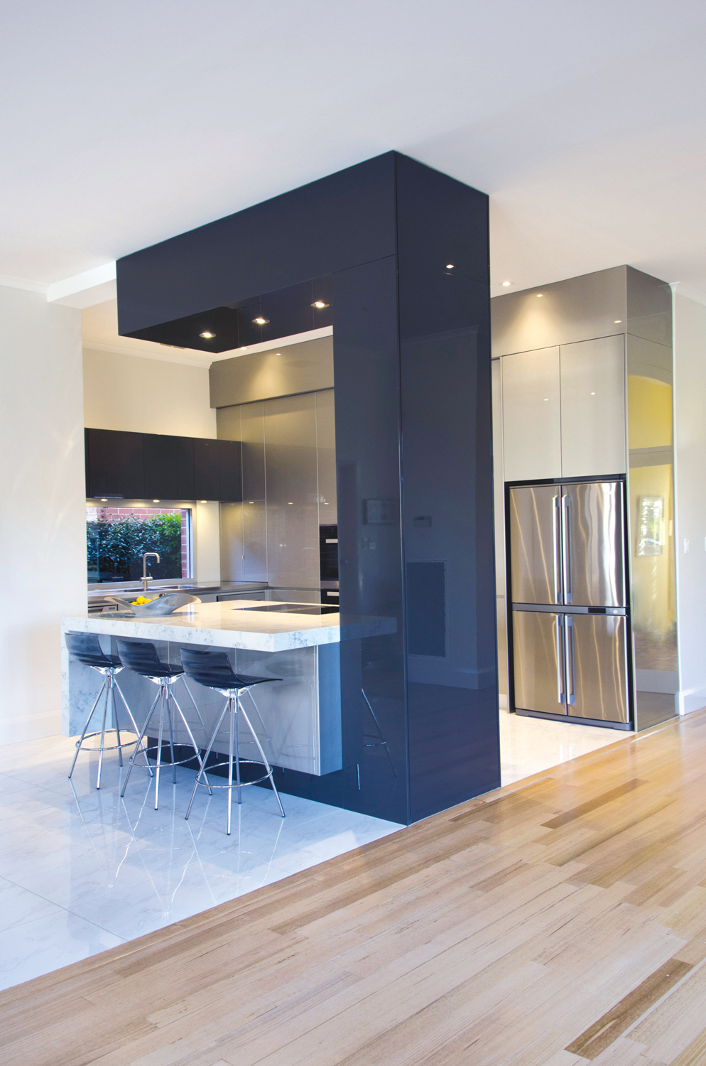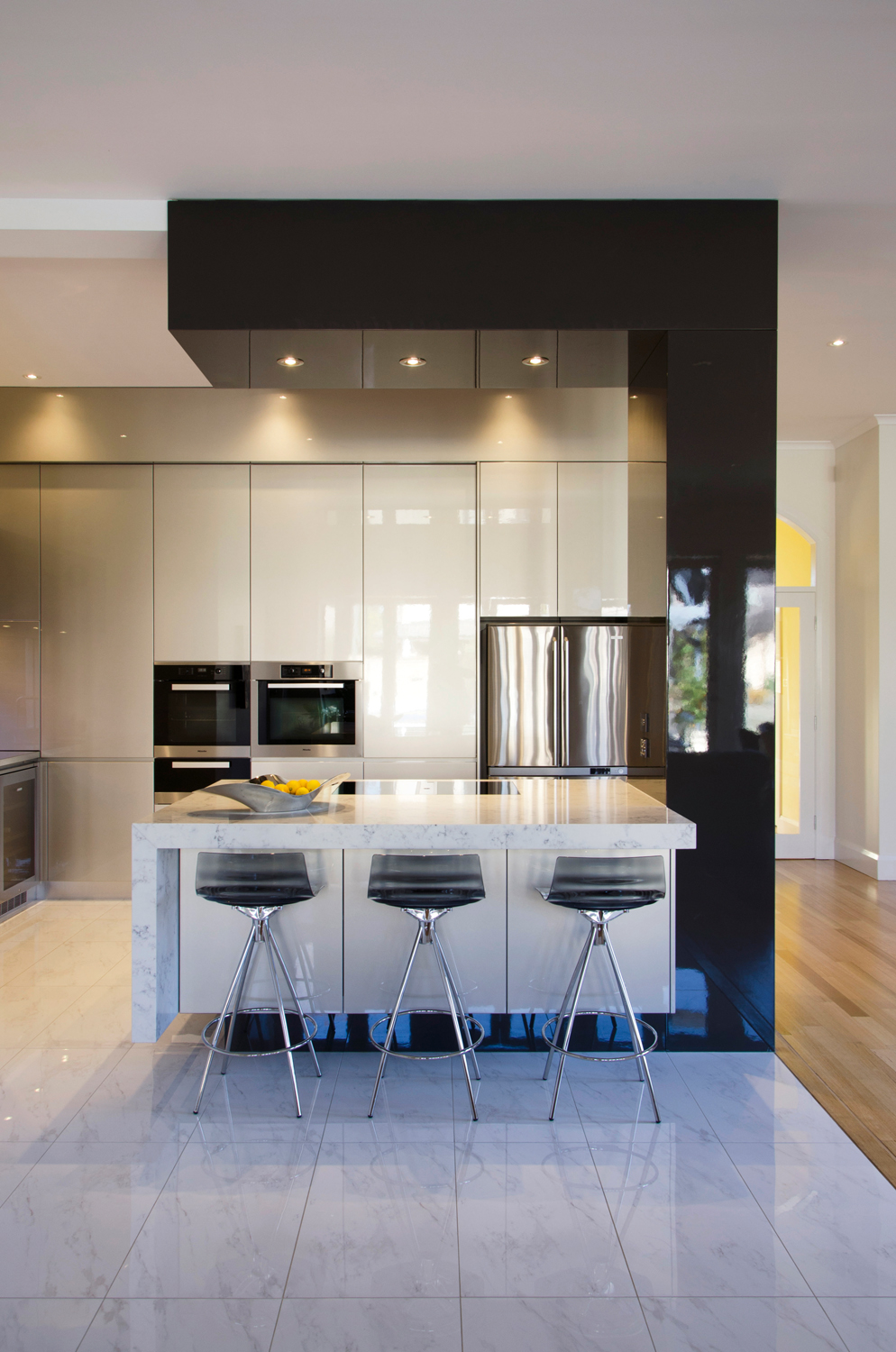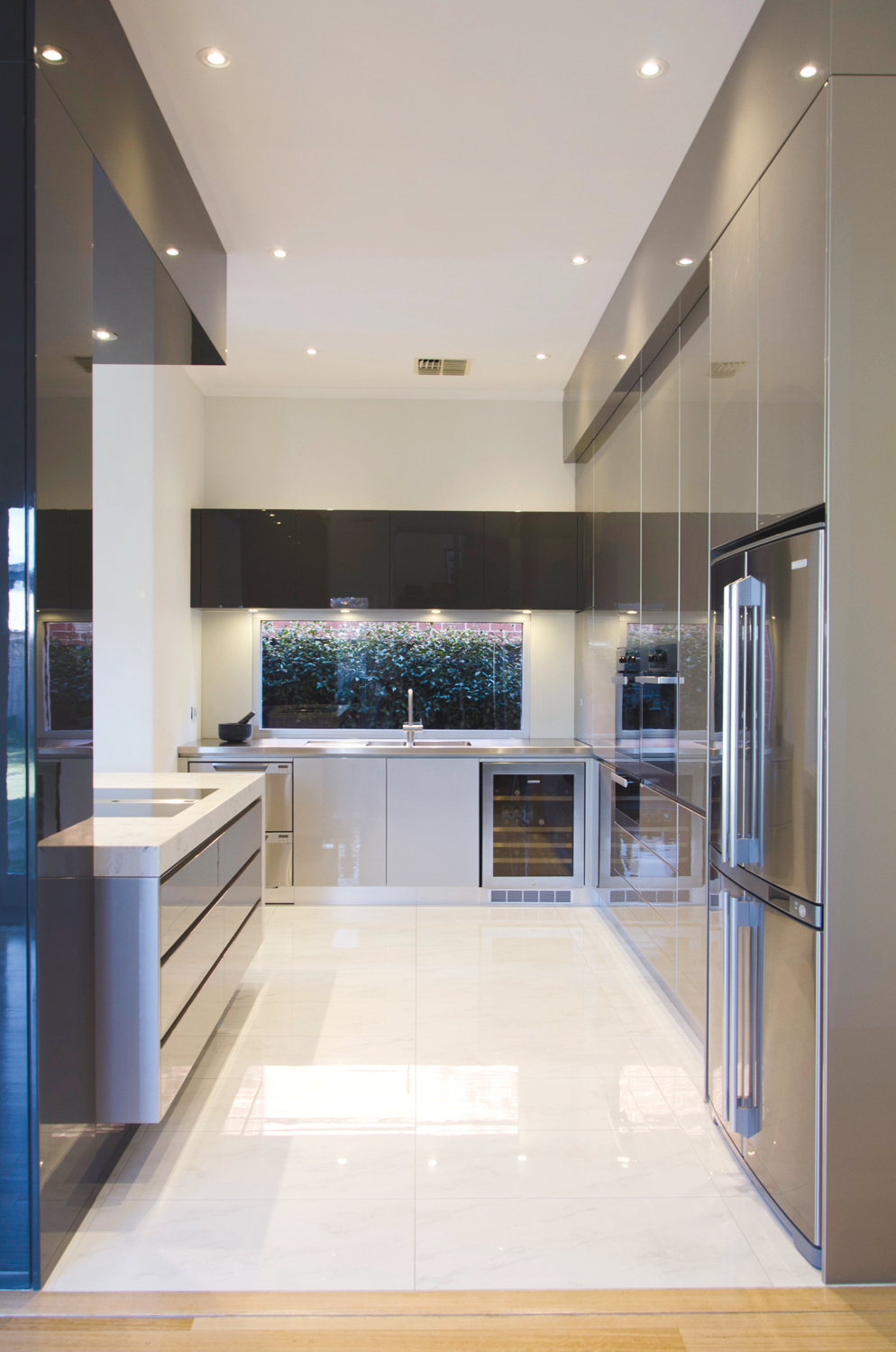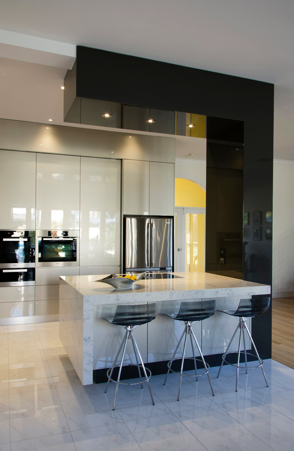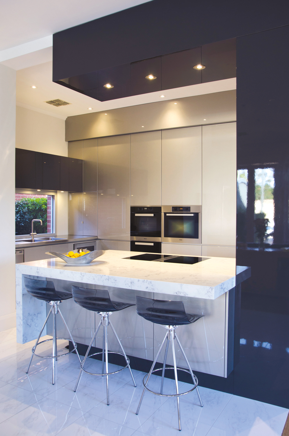 The champagne-coloured metallic colour scheme contrasts with the dark charcoal of the ‘C’ formation, emphasising the separation of cooking and entertainment areas. The stainless steel benchtop has been paired beautifully with white porcelain tiles to enhance the minimalist aesthetic as well as visually open up the space through clean, clear lines.