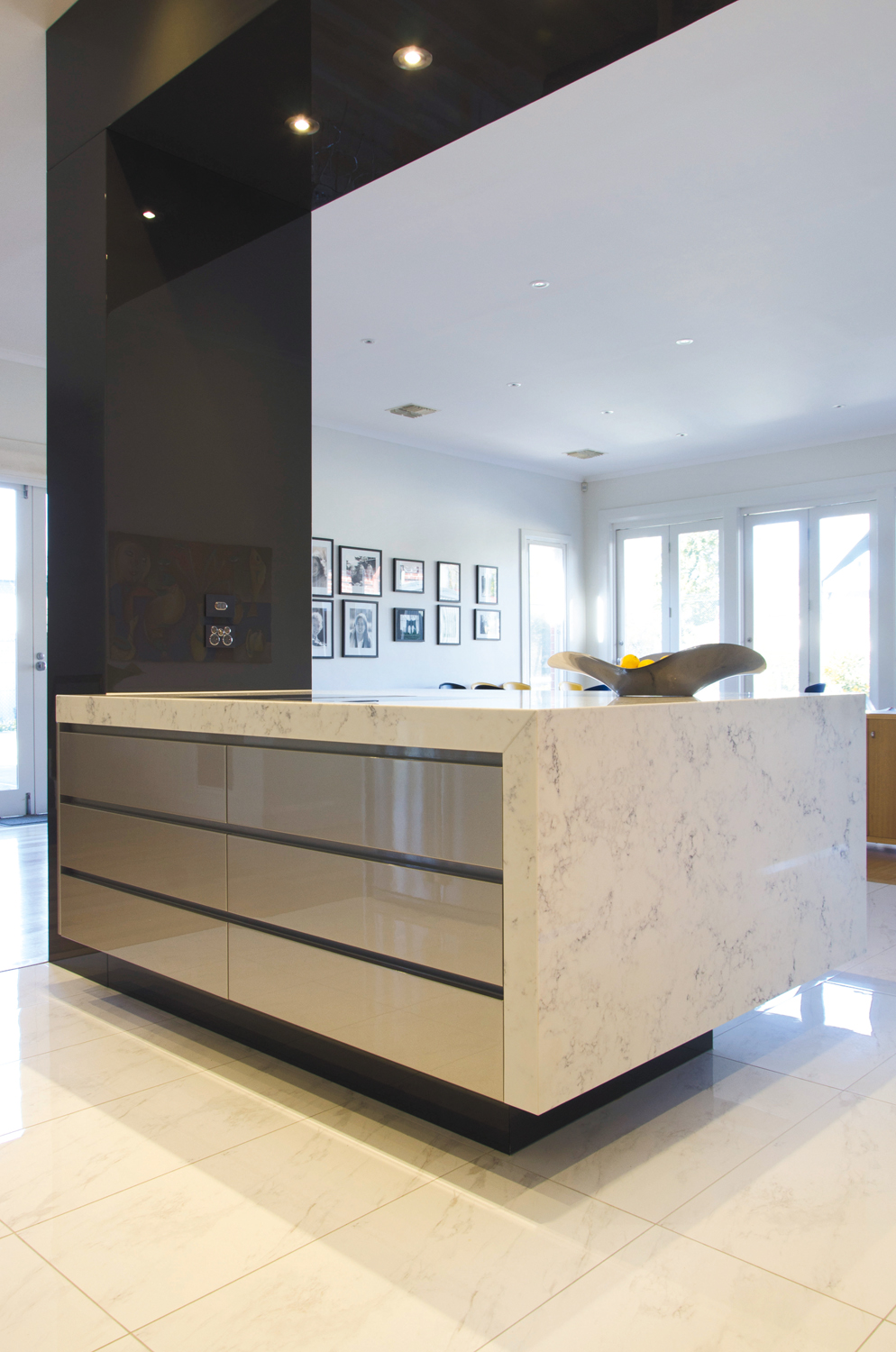 The island worktop was designed as a central meeting place for entertainment. The adjacent charcoal ‘C’ formation reinforces the island’s accessibility to guests by separating the practical workspace of the kitchen from the guest seating area. Attention to detail was important to the owners, as was the careful fusion of multiple materials and colours.