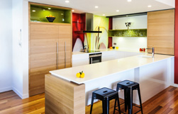 “This kitchen is a marvellous blend of form, function and fun. Our brief was to introduce space and light into a somewhat dark, confined corner kitchen. The owners are art and design lovers, so the new kitchen needed to suit their personalities, lifestyle and the architectural style of this North Fitzroy apartment. Visually, everything centres on the striking glass splashback. A prominent piece of photography, the artwork injects vibrant colours and playful lines into the space.