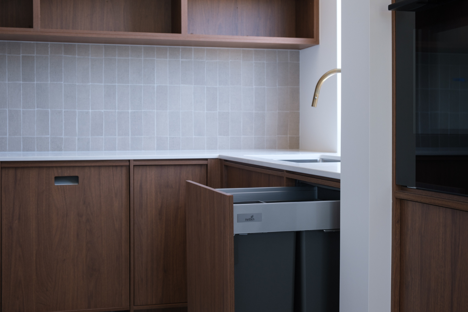 The drawer system also pays attention to internal organisation, recognising its significance in kitchen arrangement. This allows homeowners to customise their storage, whether they prefer easy access to spices or neatly arranged knife holders with unique internal accessory options.