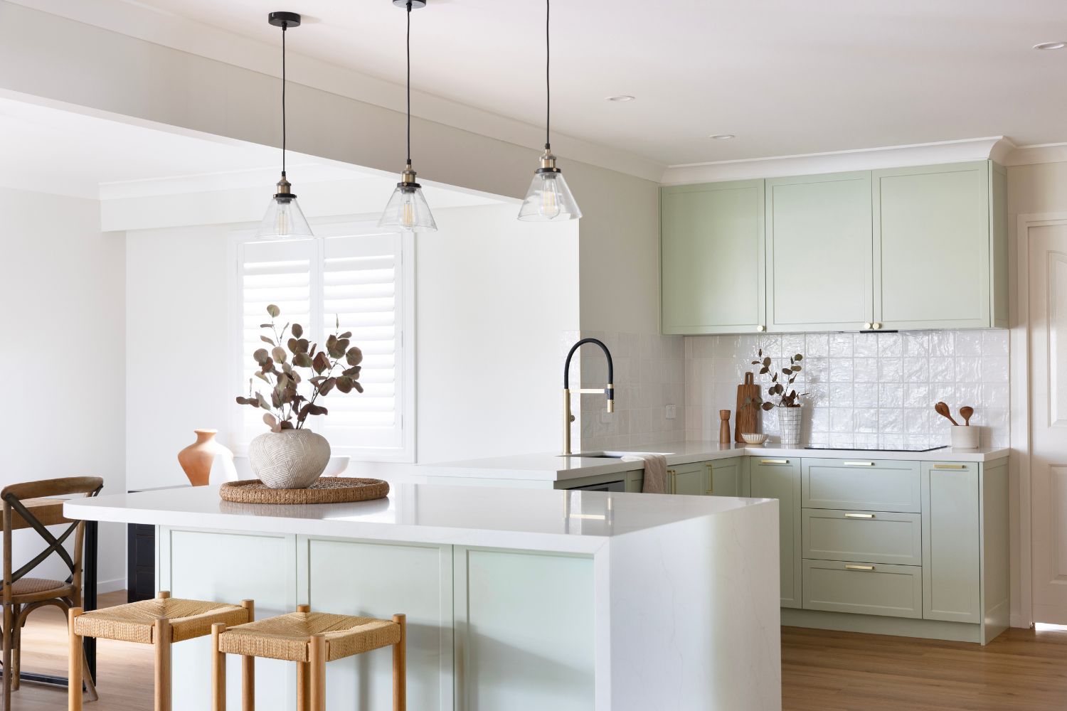 Inspired by the clients’ eucalyptus artwork, a soft, nature-led palette was developed. Shaker-style cabinetry in a sophisticated two-tone scheme brings timeless appeal, while a subtle earthy green complements textured gloss-white tiles. Light timber-look flooring adds warmth, creating a refined base for the space. Brushed-gold tapware and fittings provide just the right amount of elevation, introducing a touch of understated luxury, complemented by Dorset Touch handles in brushed brass.