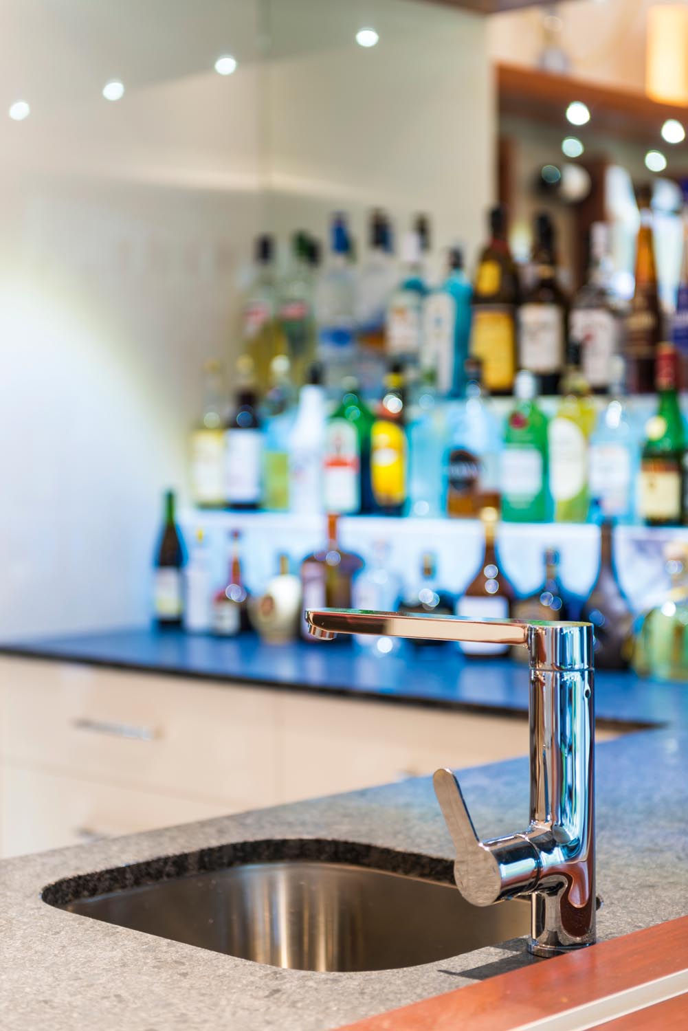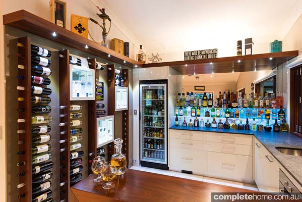 “The homeowner wanted a bar to also function as a convenient second kitchen. This self-sufficient bar with oven and sink has enough bench space and storage to serve the billiard room, which flows to a larger entertaining area and the outdoor entertaining space.