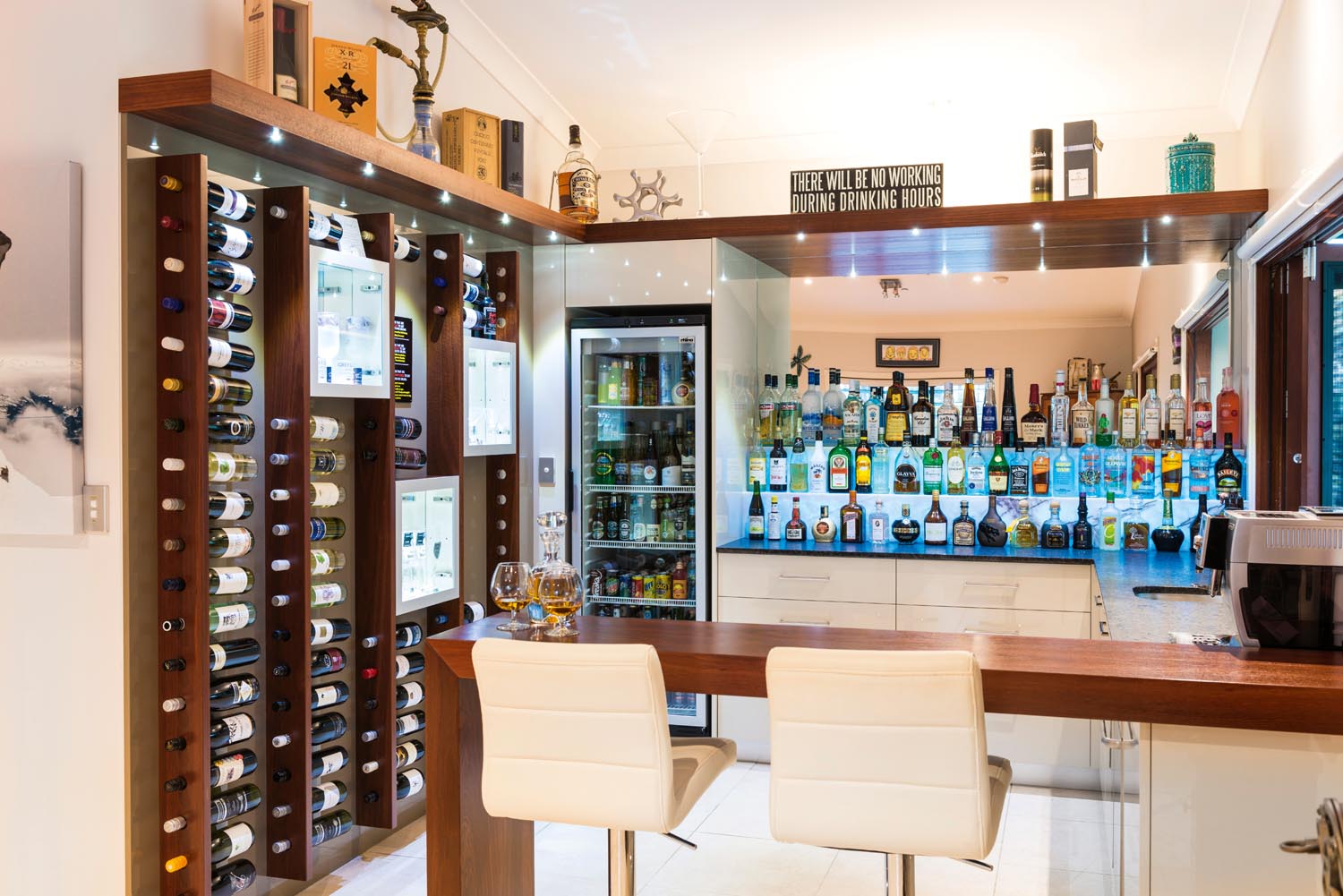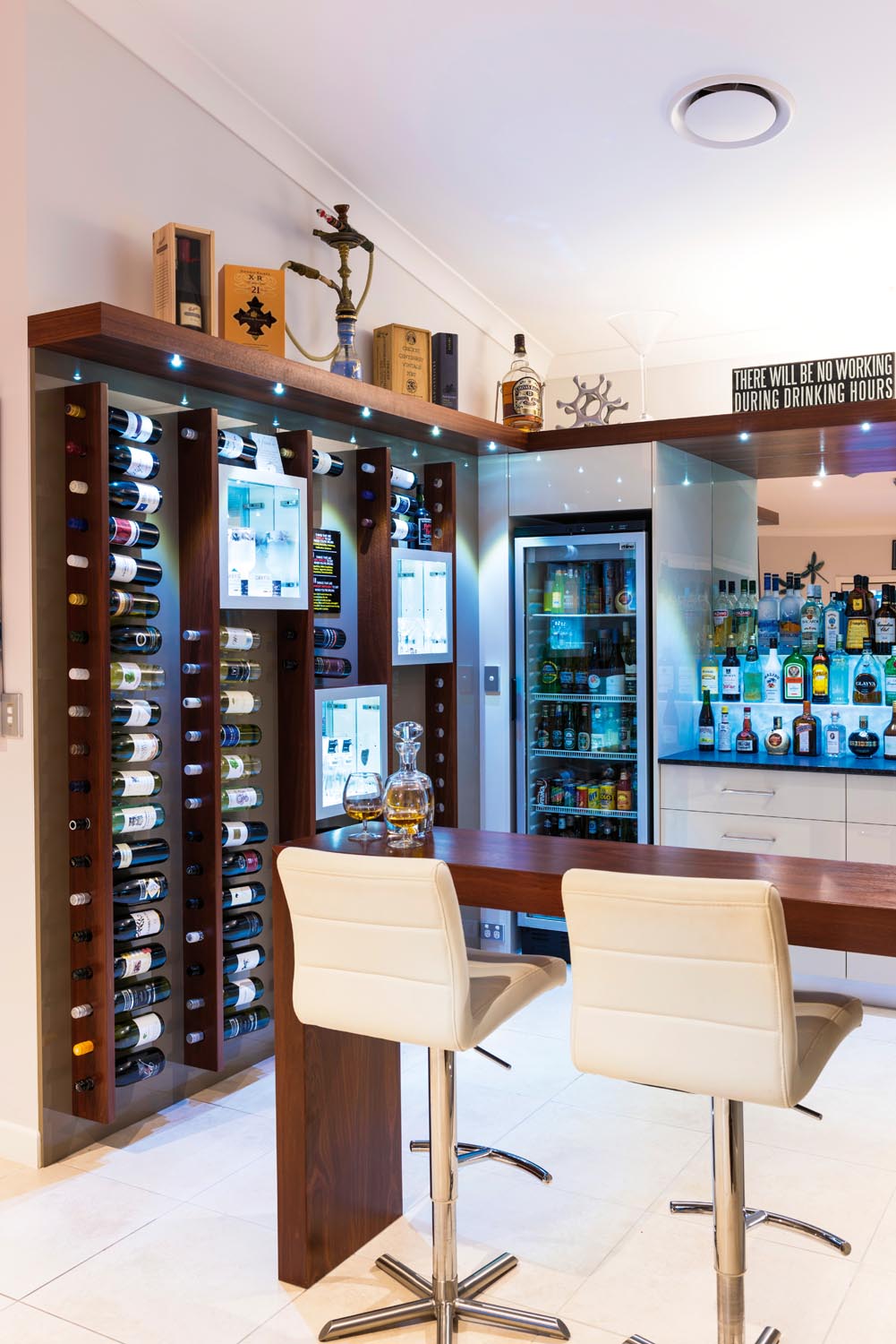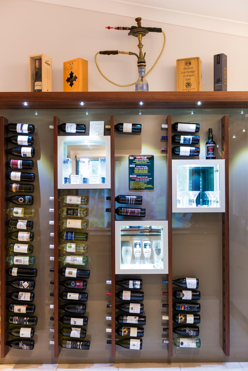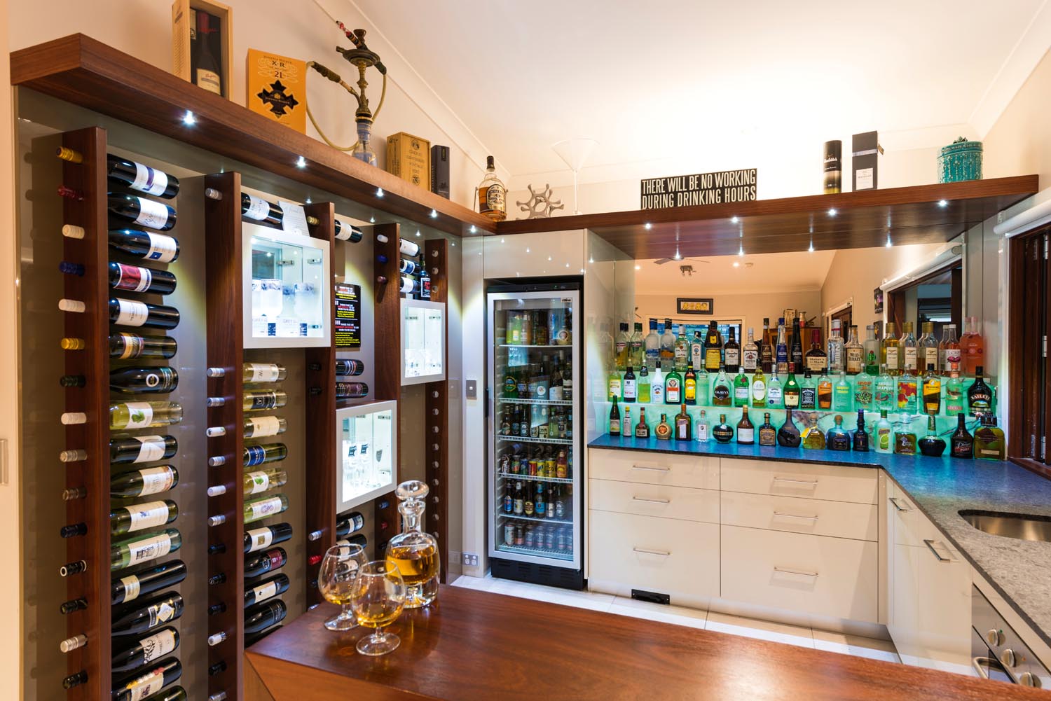 The large mirror splashback and back-lit stepped marble shelves are a focal point of the design, while on the adjacent wall, three illuminated display boxes are a feature of the wine display. A timber counter with waterfall end completes the design.”