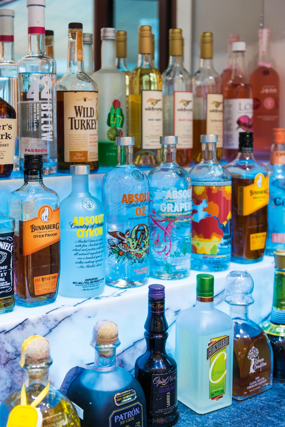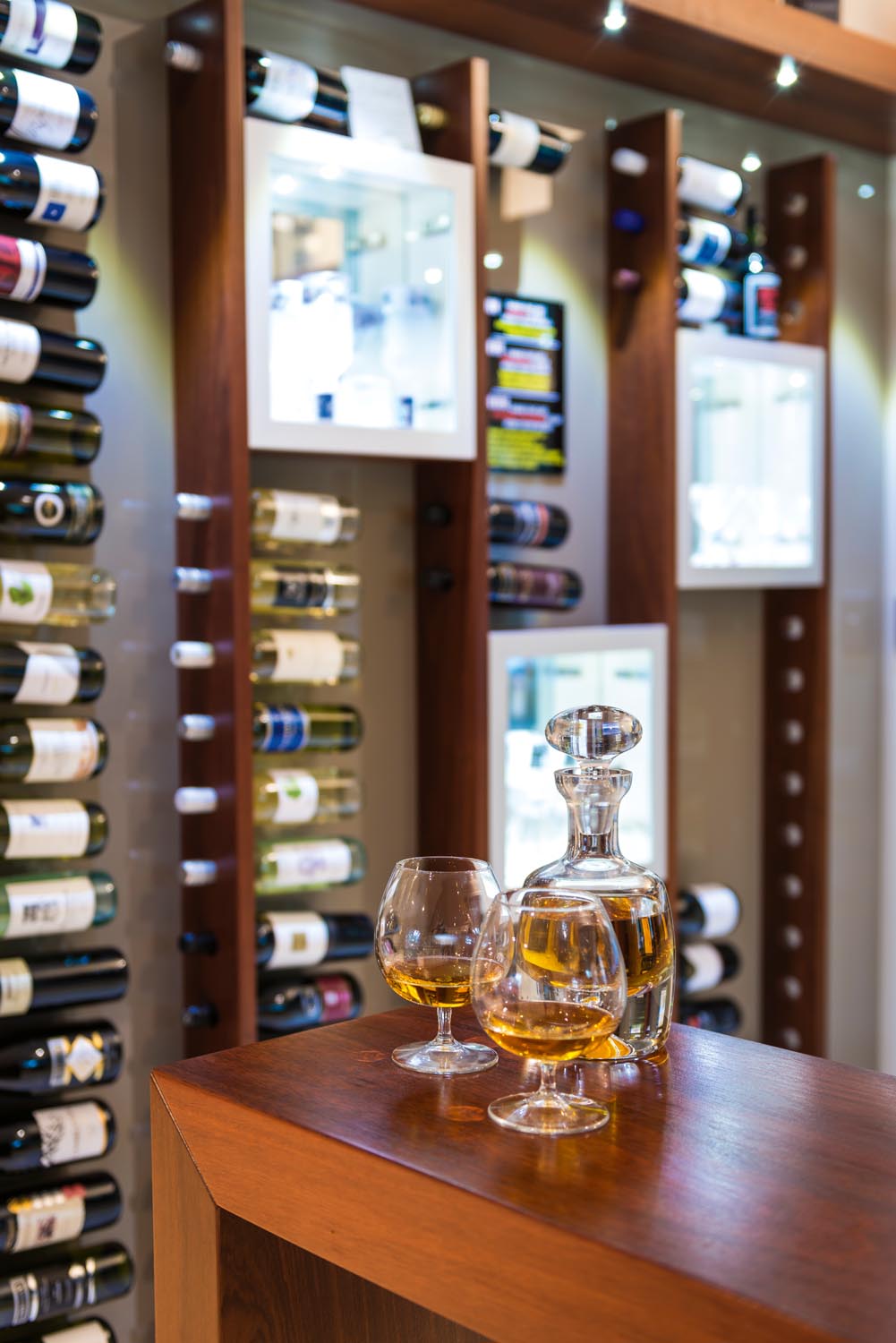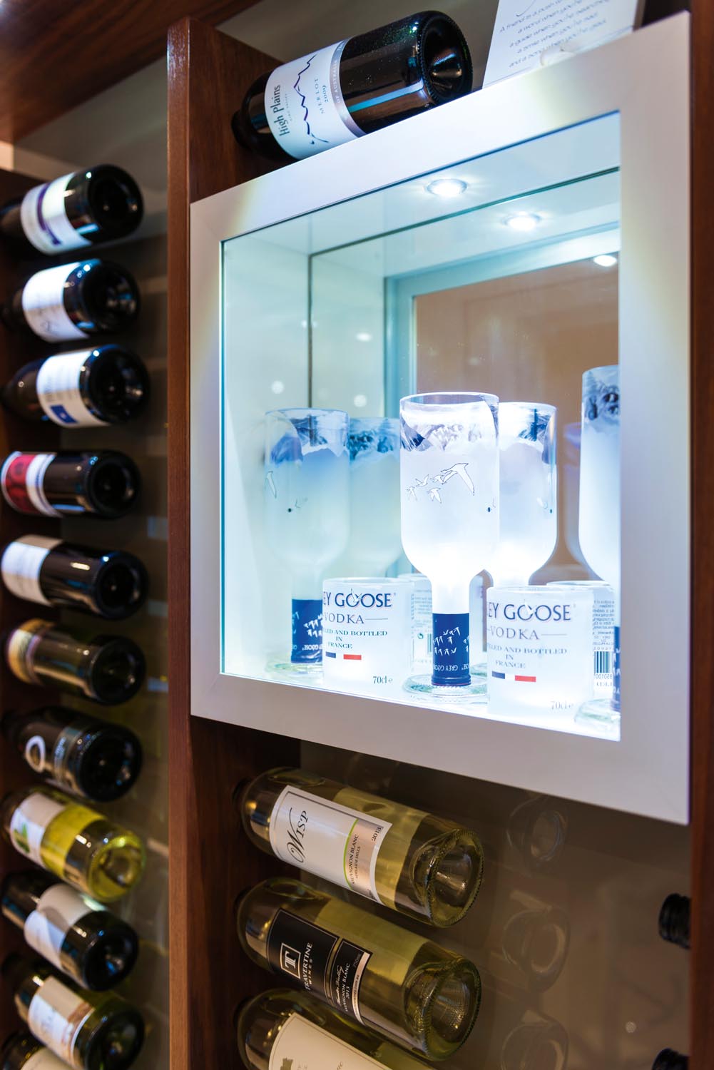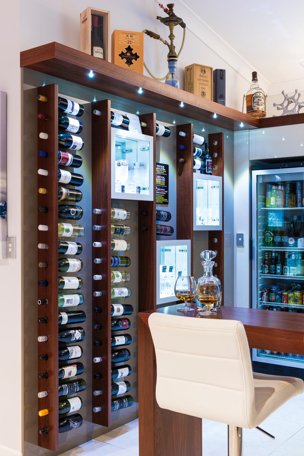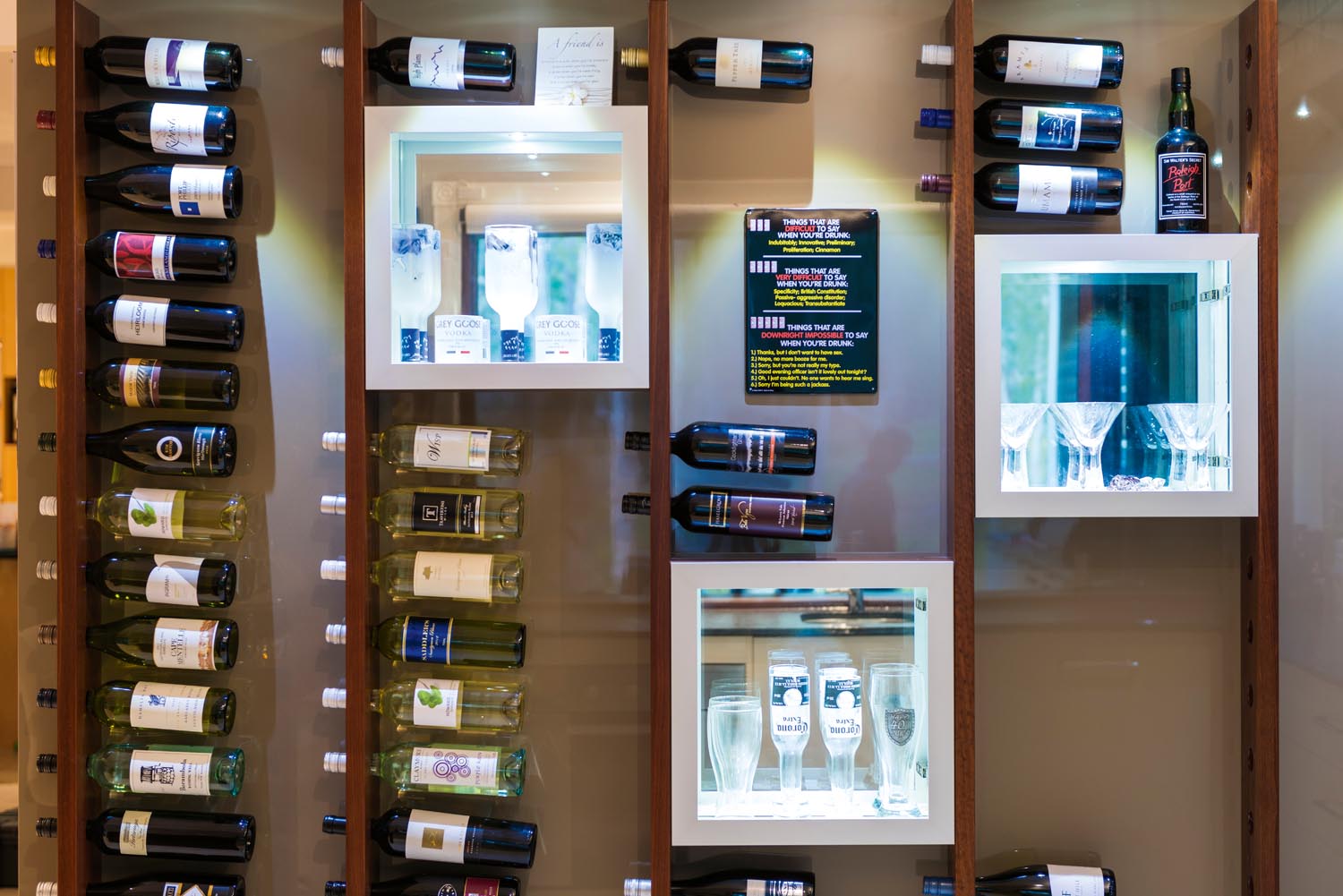The large mirror splashback and back-lit stepped marble shelves are a focal point of the design, while on the adjacent wall, three illuminated display boxes are a feature of the wine display. A timber counter with waterfall end completes the design.”