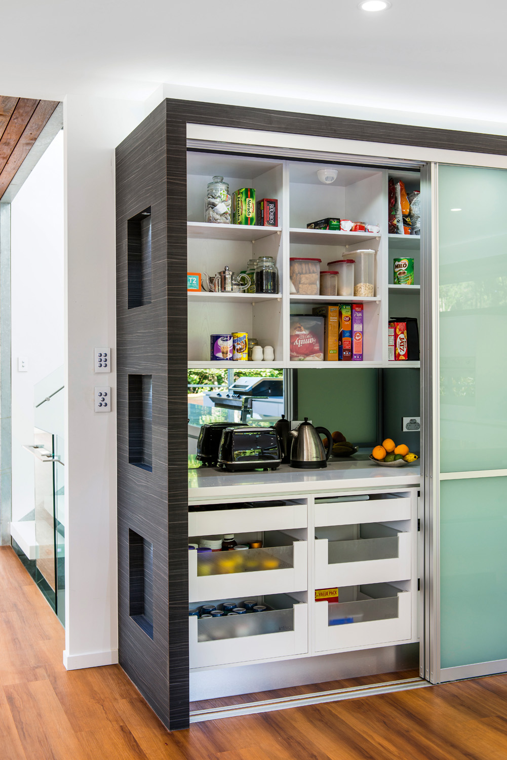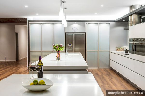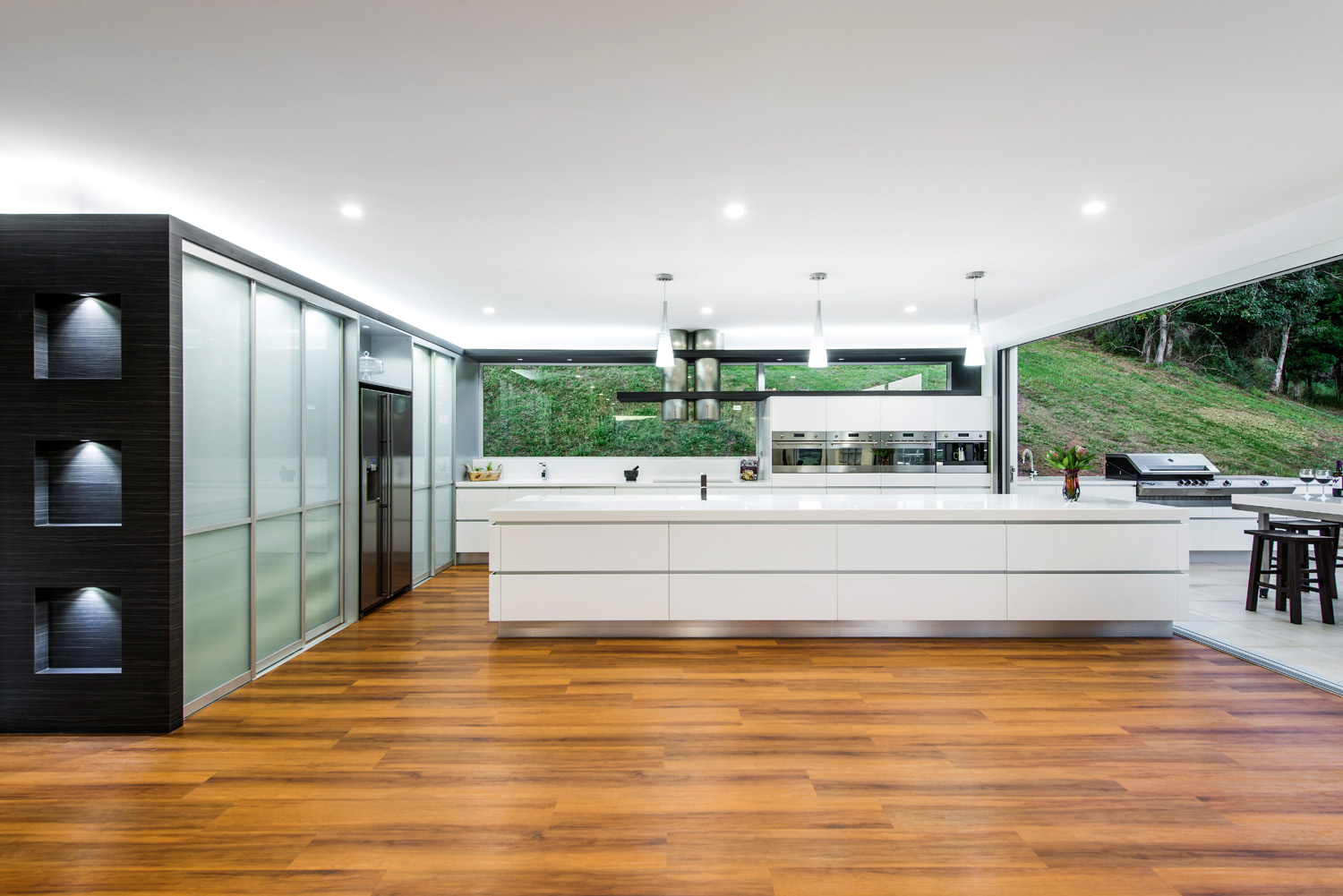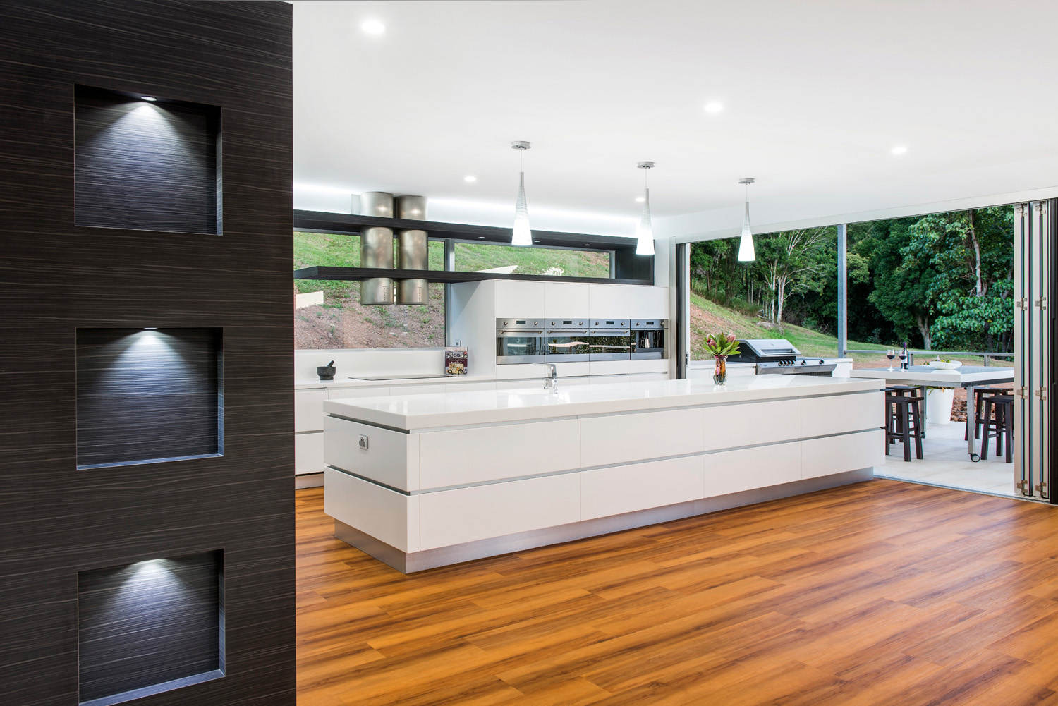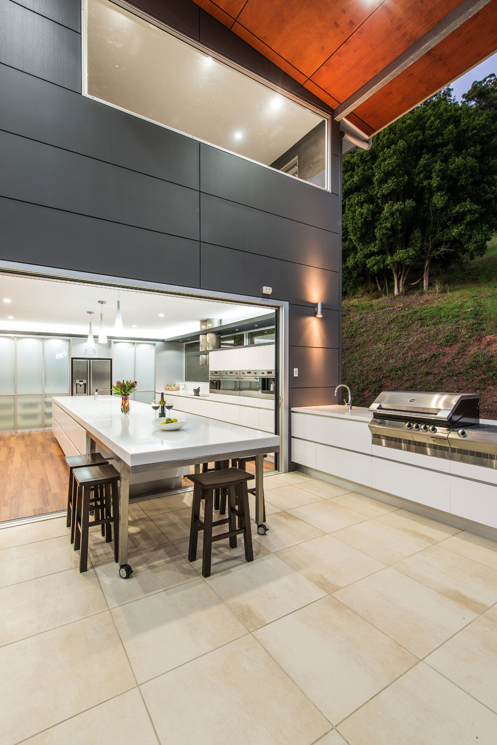 Lighting has been applied extensively throughout the indoor/outdoor space, giving it a luminescent appeal. It all starts with the LED lights running above the laminate flyover, followed by LED downlights housed under the flyover, providing task lighting for the user. The LED lights then continue, accenting the underside of the island bench.