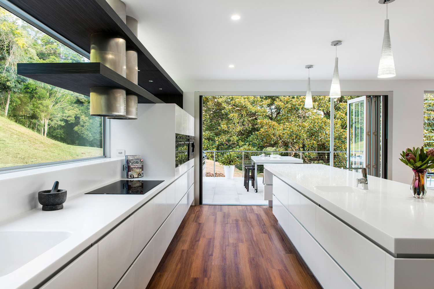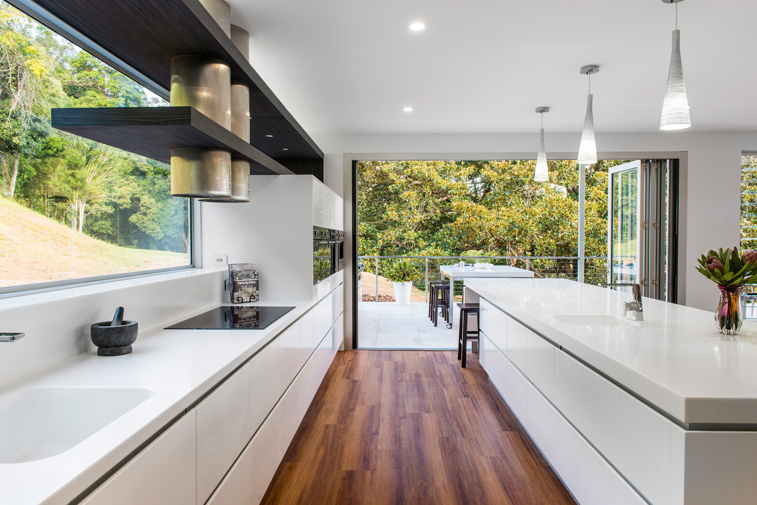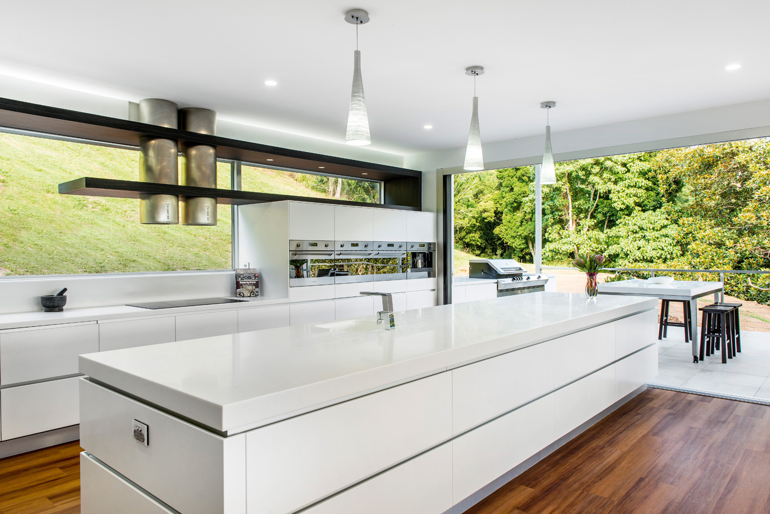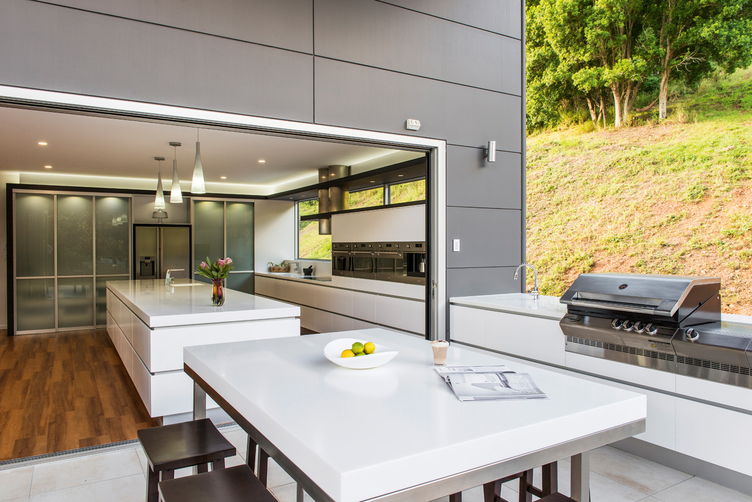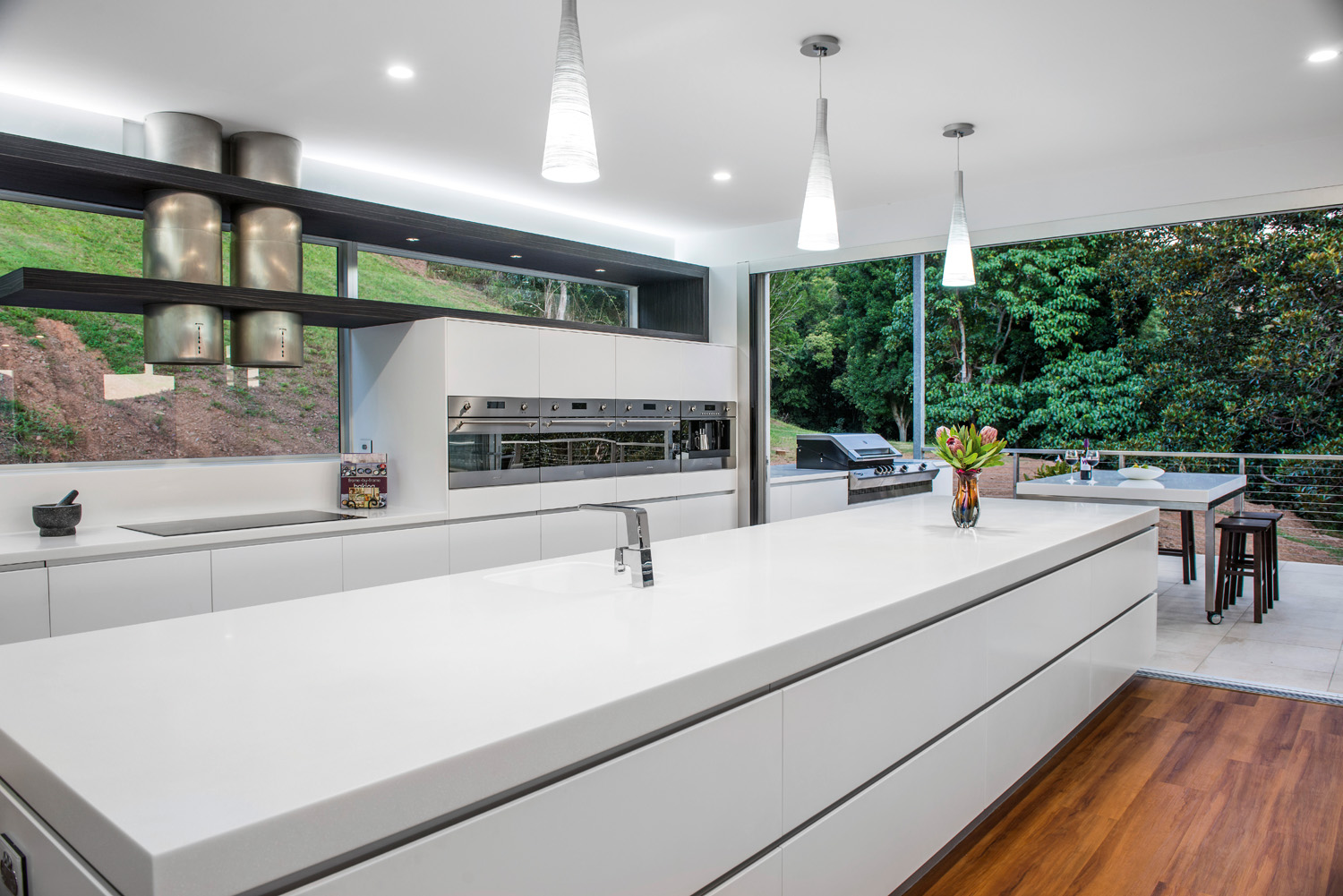 Extensive Blum hardware has also been used to make accessing cupboards and drawers easy. The use of materials such as Staron®, that continue from the inside and extend to the outdoor area, really blurs the line between the two spaces. Overall, this stunning area adapts perfectly from family living to entertaining, with an ergonomic design that takes in the beautiful surroundings and is inviting to be in.”