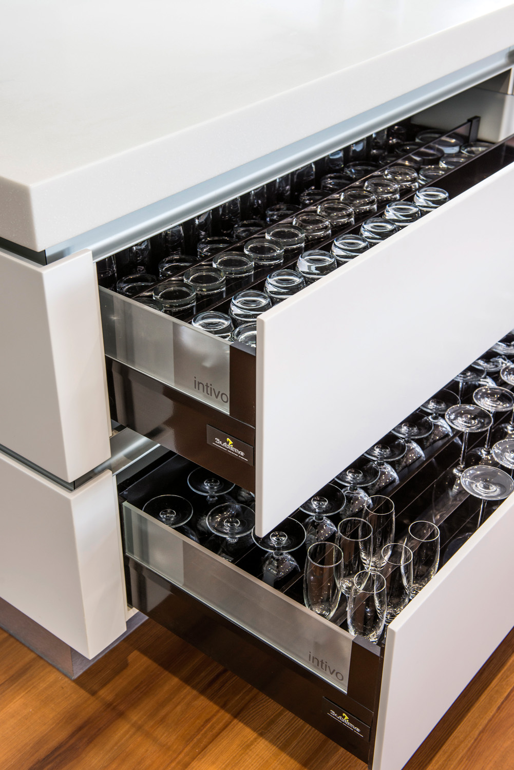 One of the key features of this kitchen is the use of solid surfaces, with various thicknesses stimulating the appeal. Staron® offered a timeless design that would not compete with the featured surrounds. Its easy maintenance makes entertaining and everyday living simple, and Staron® is also suitable to withstand environmental elements such as direct UV light.