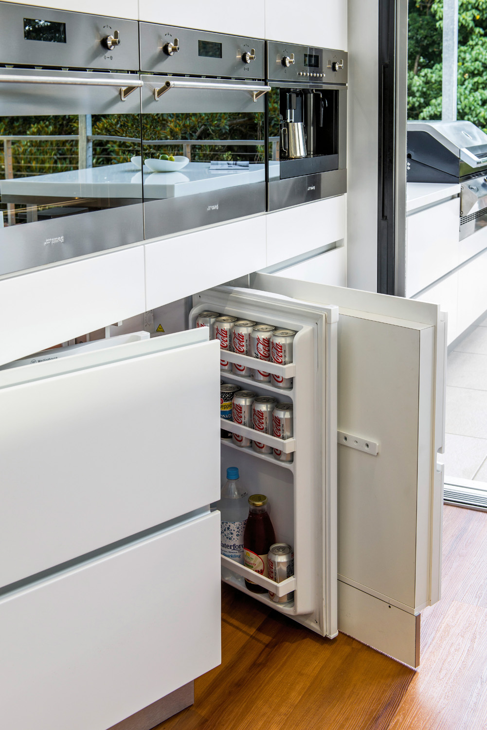 The Staron® surface continues outside to the integrated sink and barbecue area, used for the benchtops and doors. I wanted to create a kitchen space that allowed many users at the same time, and ensured that the cook is always a part of the entertaining; to achieve this, I banked the Smeg cooking appliances together to help retain and encourage the overall linear feel and flow of the space. Integrated fridges have been placed just inside the rear bi‐fold doors so they can be easily used by people both inside and out.