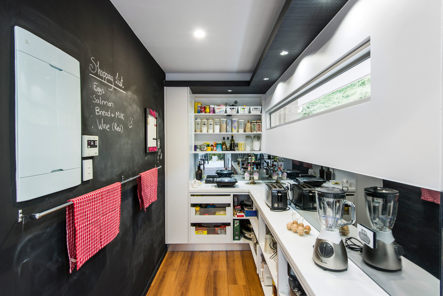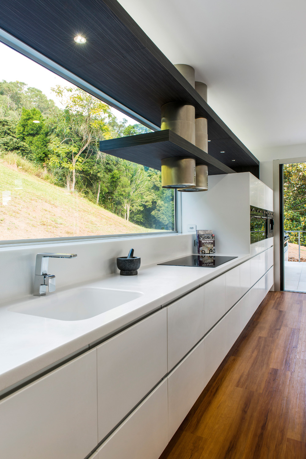 A modern, bright and eclectic kitchen which includes stellar views of the bush and valley make this kitchen a stand out
