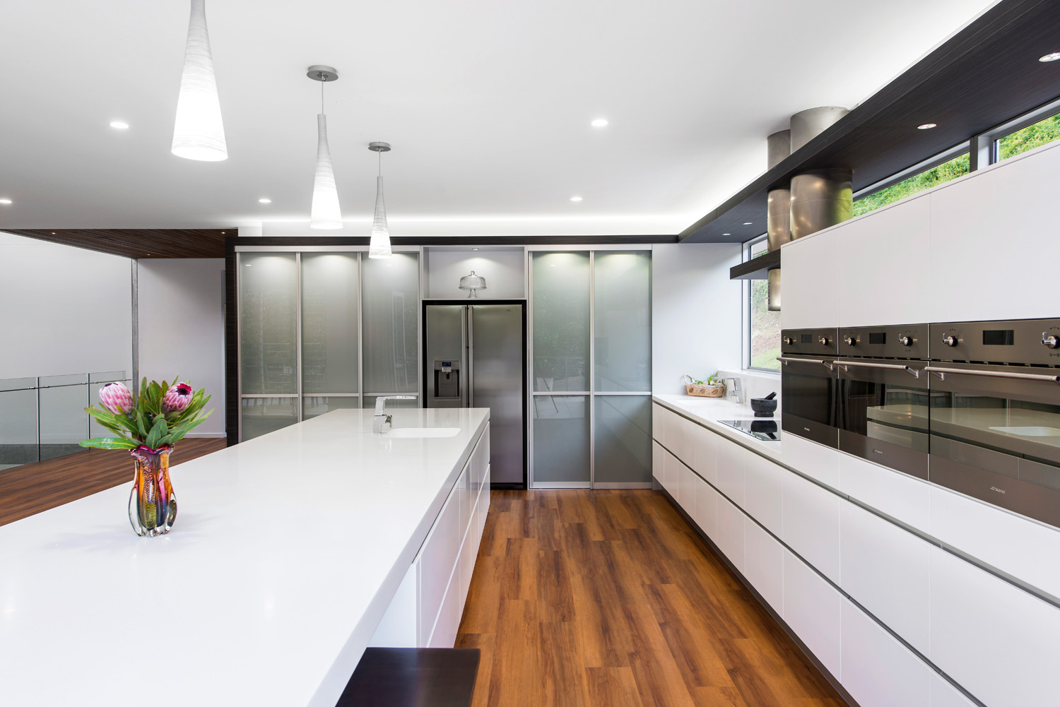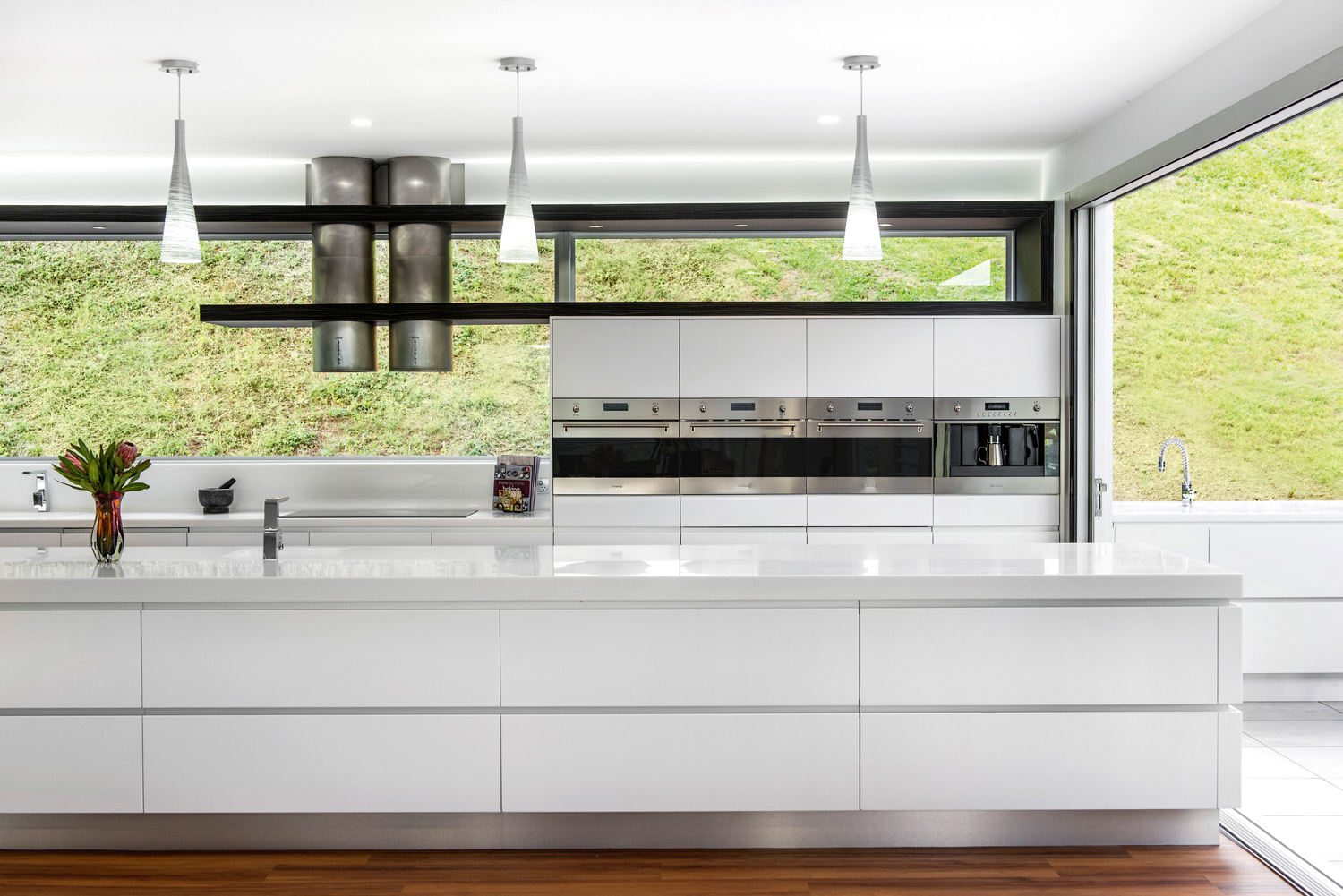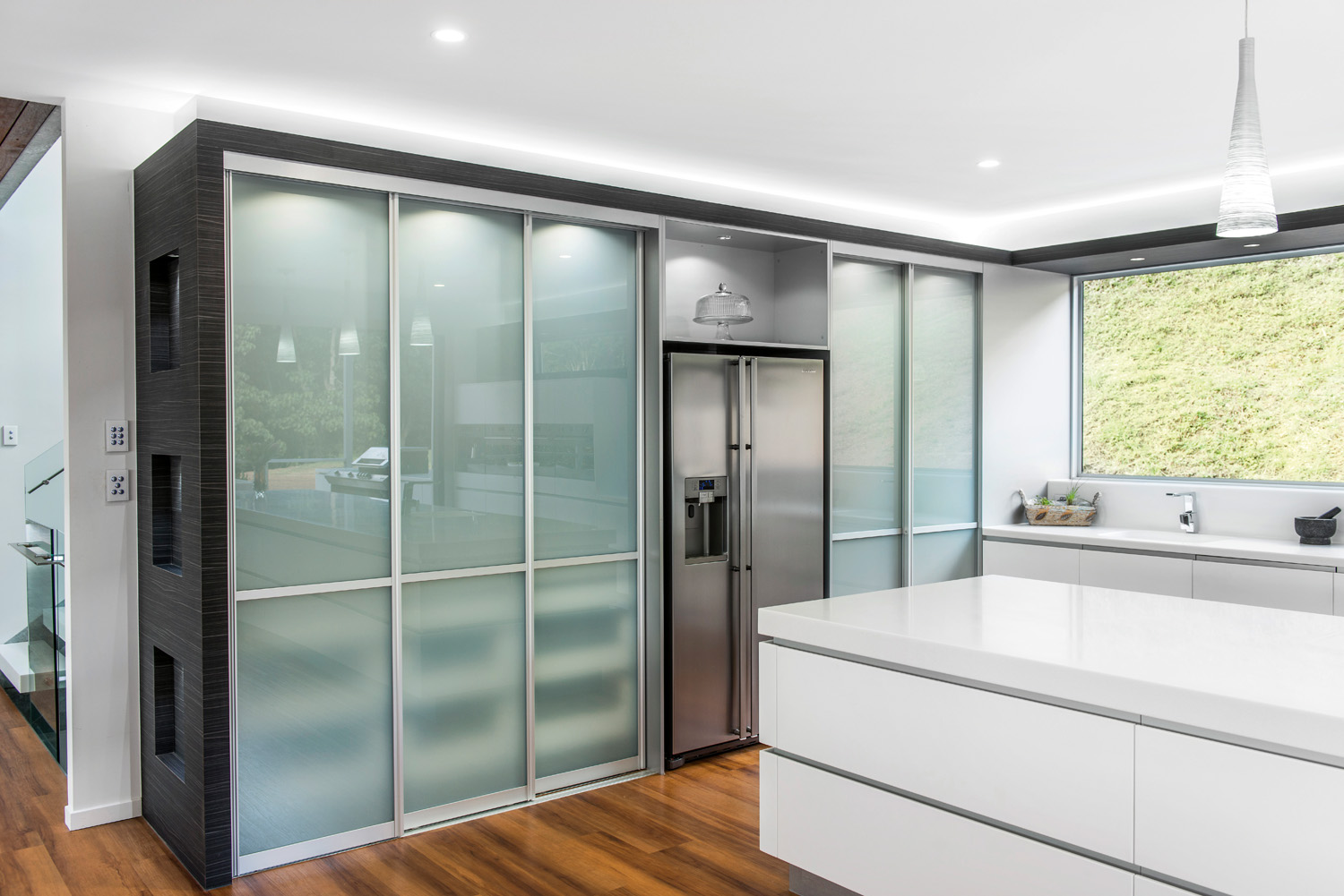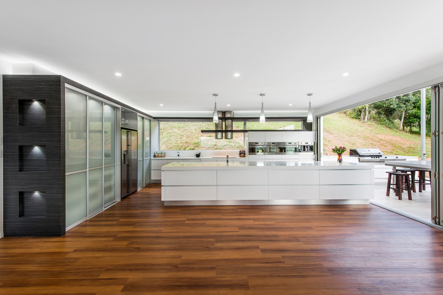With natural elements surrounding the property, I wanted to bring the outside in. I did this by using bi‐fold doors that open all the way to join the kitchen to the alfresco area. I also decided to use a fixed window as the splashback at the rear that continues over the side-by-side appliances positioned midpoint that the views are maximised.