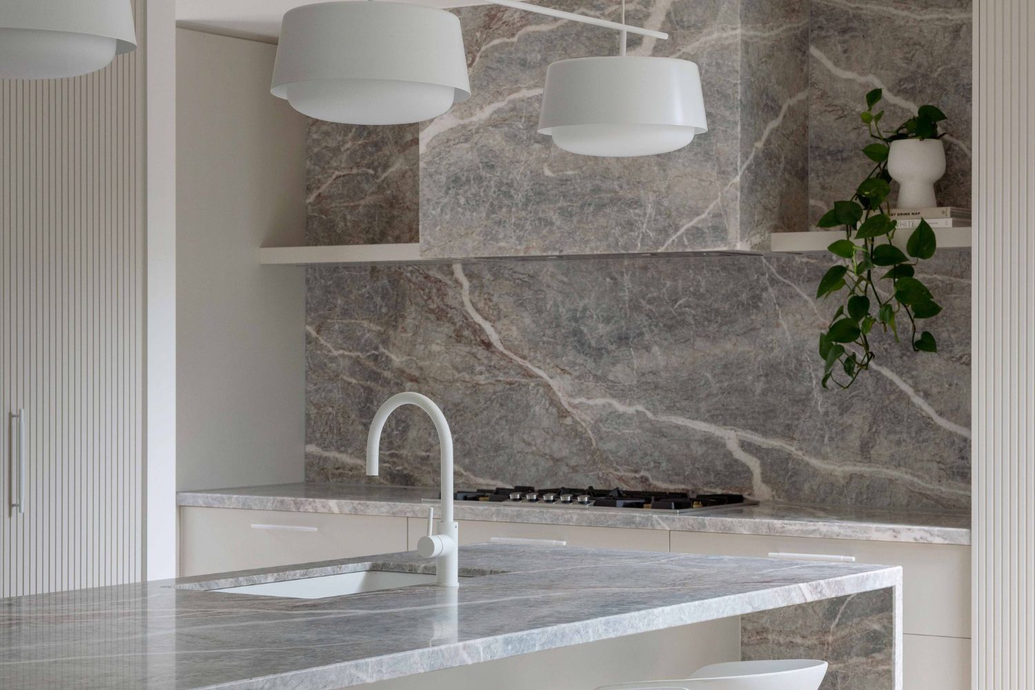 At the core of this captivating kitchen is a commitment to minimalist design. Its nuanced palette and sophisticated material choices provide an elevated finish. The white fluted cabinetry presents a contemporary aesthetic, complemented by carefully selected pendants and cabinetry hardware. While these elements work in harmony to establish a synergistic design, it’s the exquisite Fior Di Pesco marble that emerges as the true hero of the space.