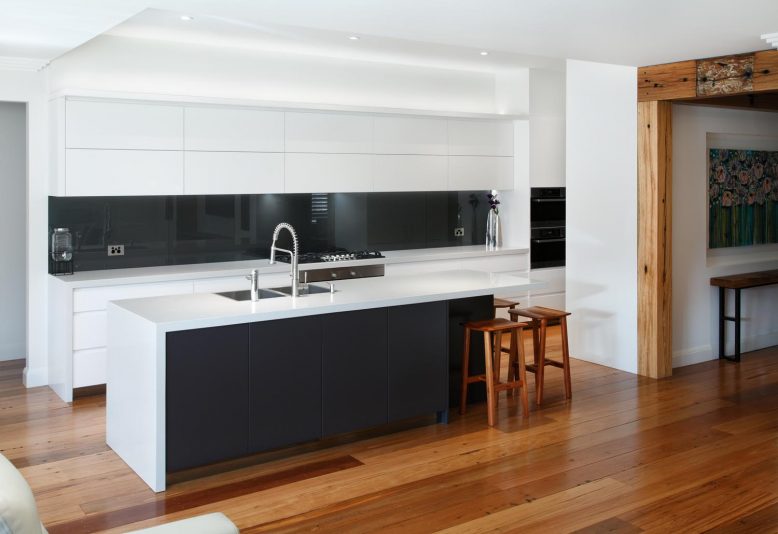 This black and white kitchen is both bold and attractive – incorporating natural elements such as timber to make it light and homely