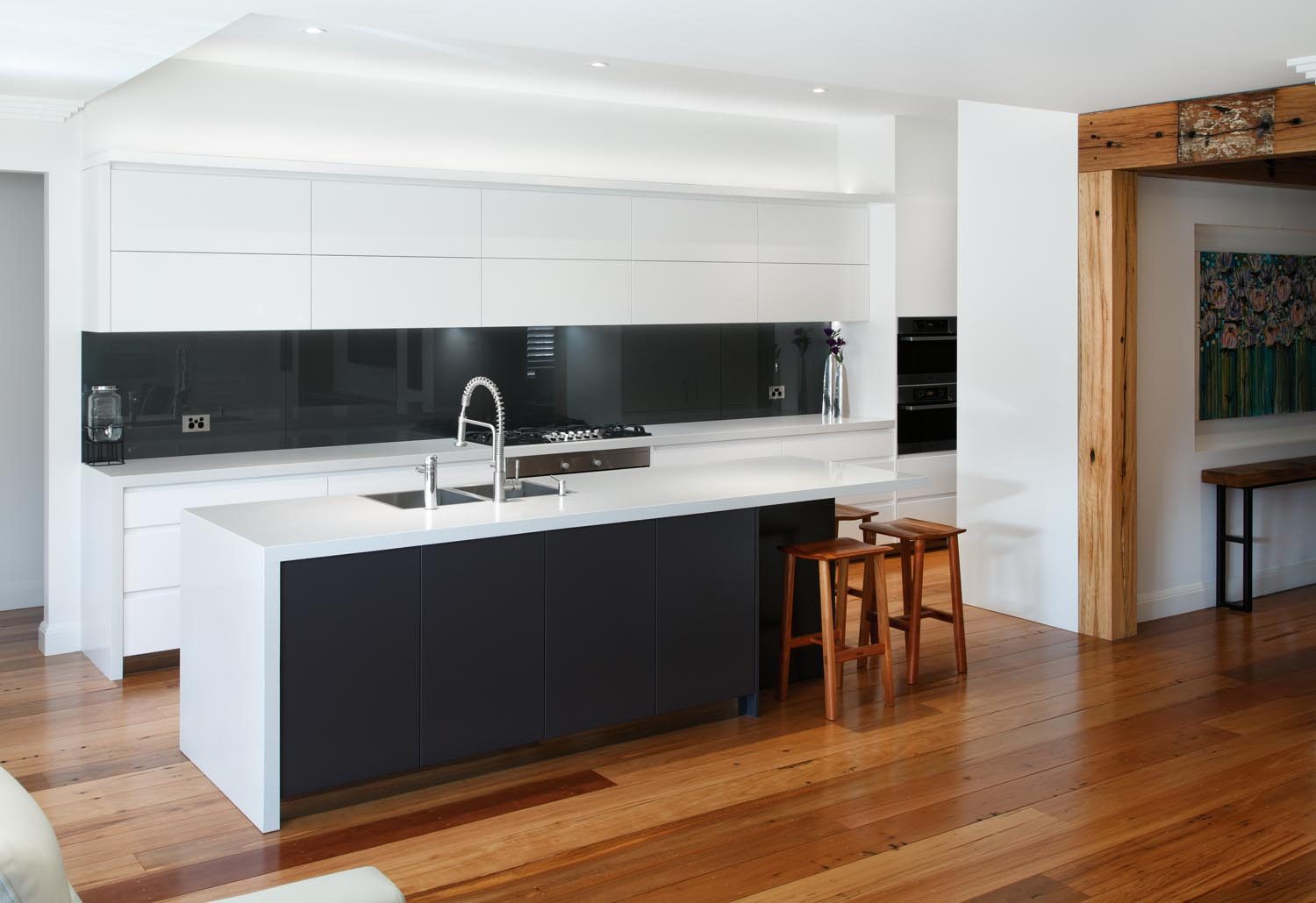We created a walk-in pantry and appliance zone to one end of the kitchen, cleverly concealed so it’s only visible once you’re in the kitchen or meals area. Here, there is ample storage space for everything the owners could need without detracting from the clean minimalist look they desired. The balanced pairing of light and dark tones creates a sophisticated colour palette in powerful contrast to the warm radiance of the timber floor. The result is a kitchen that achieves minimal design for maximum impact.”