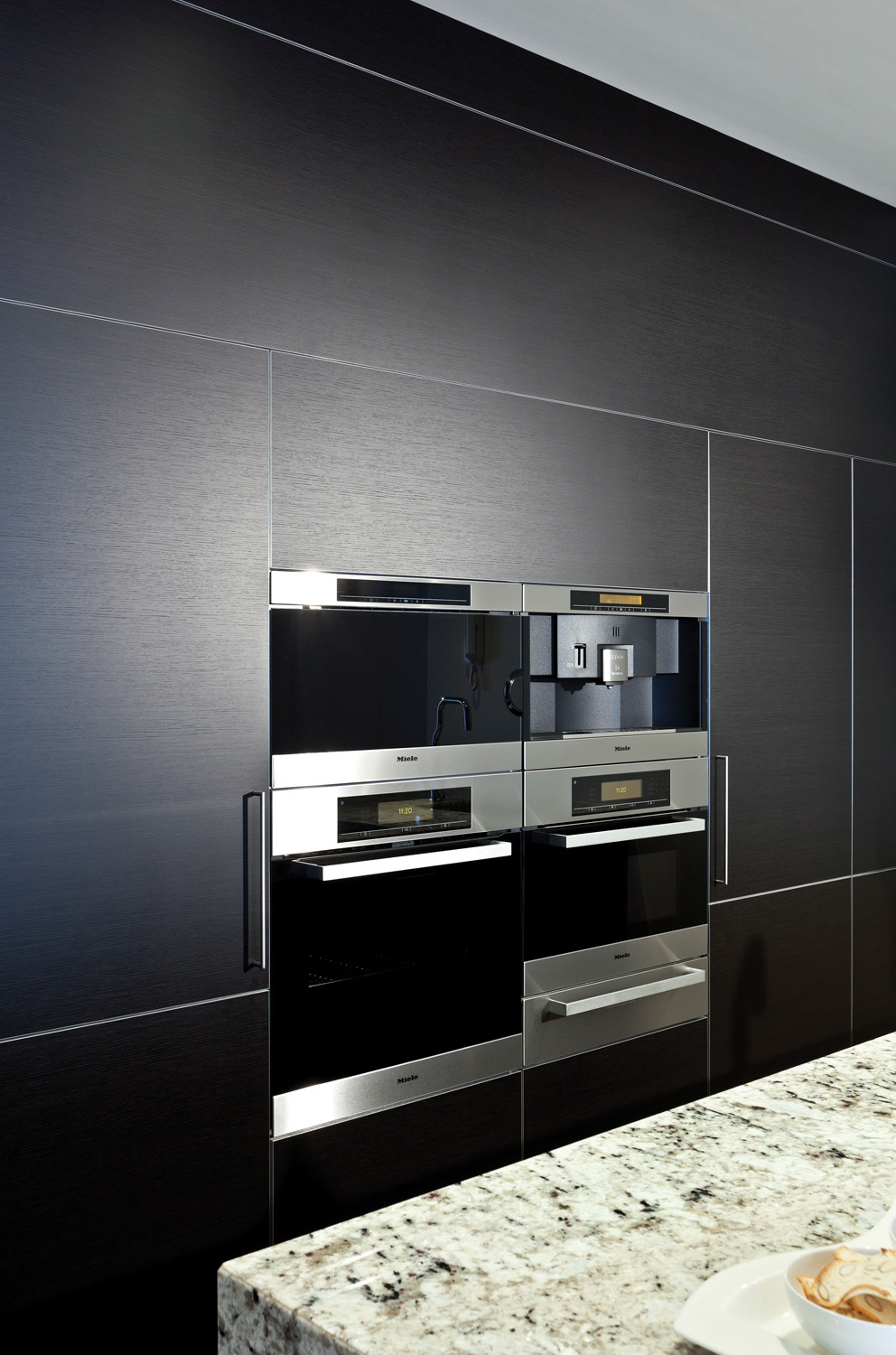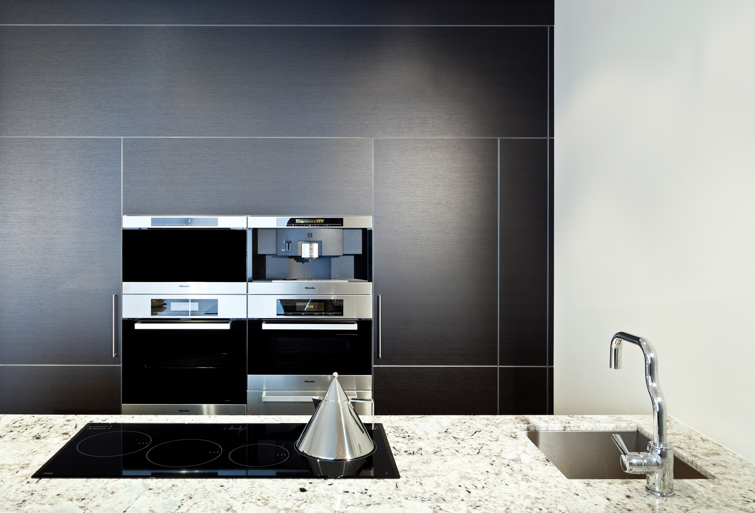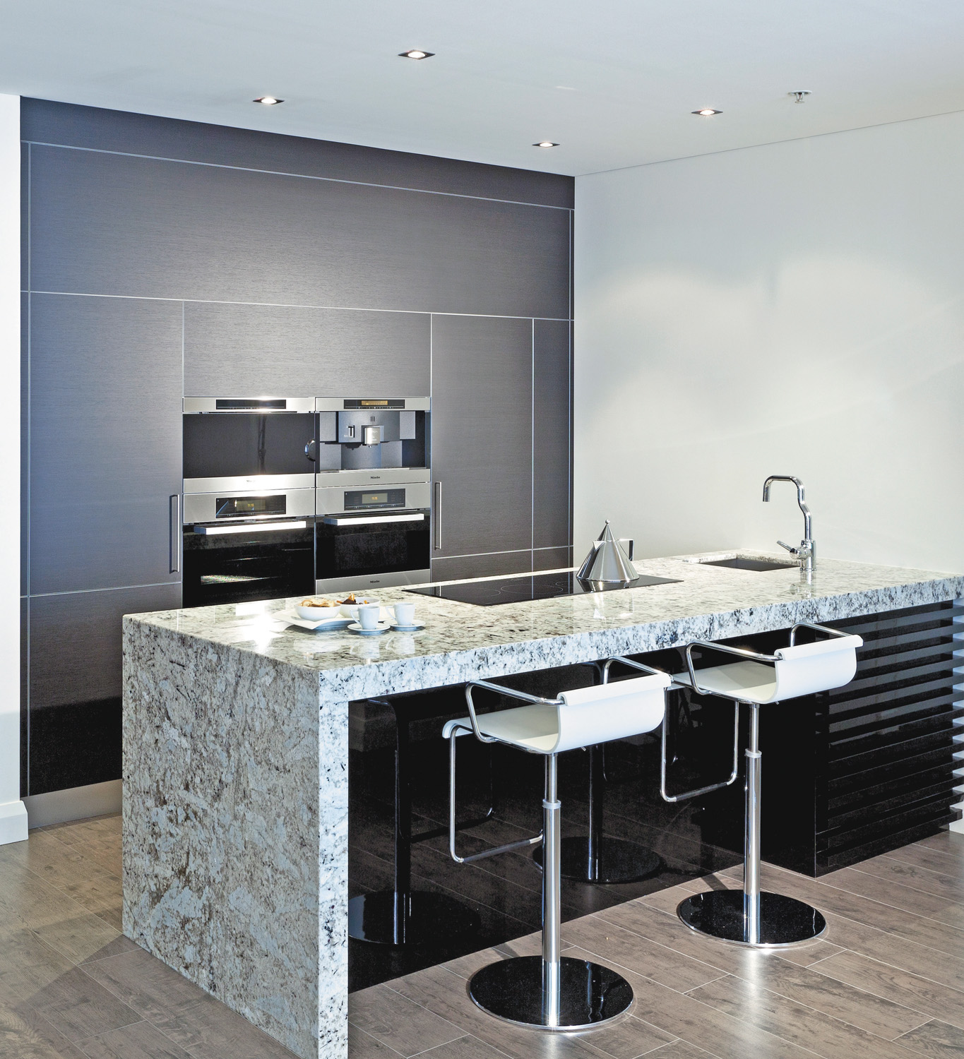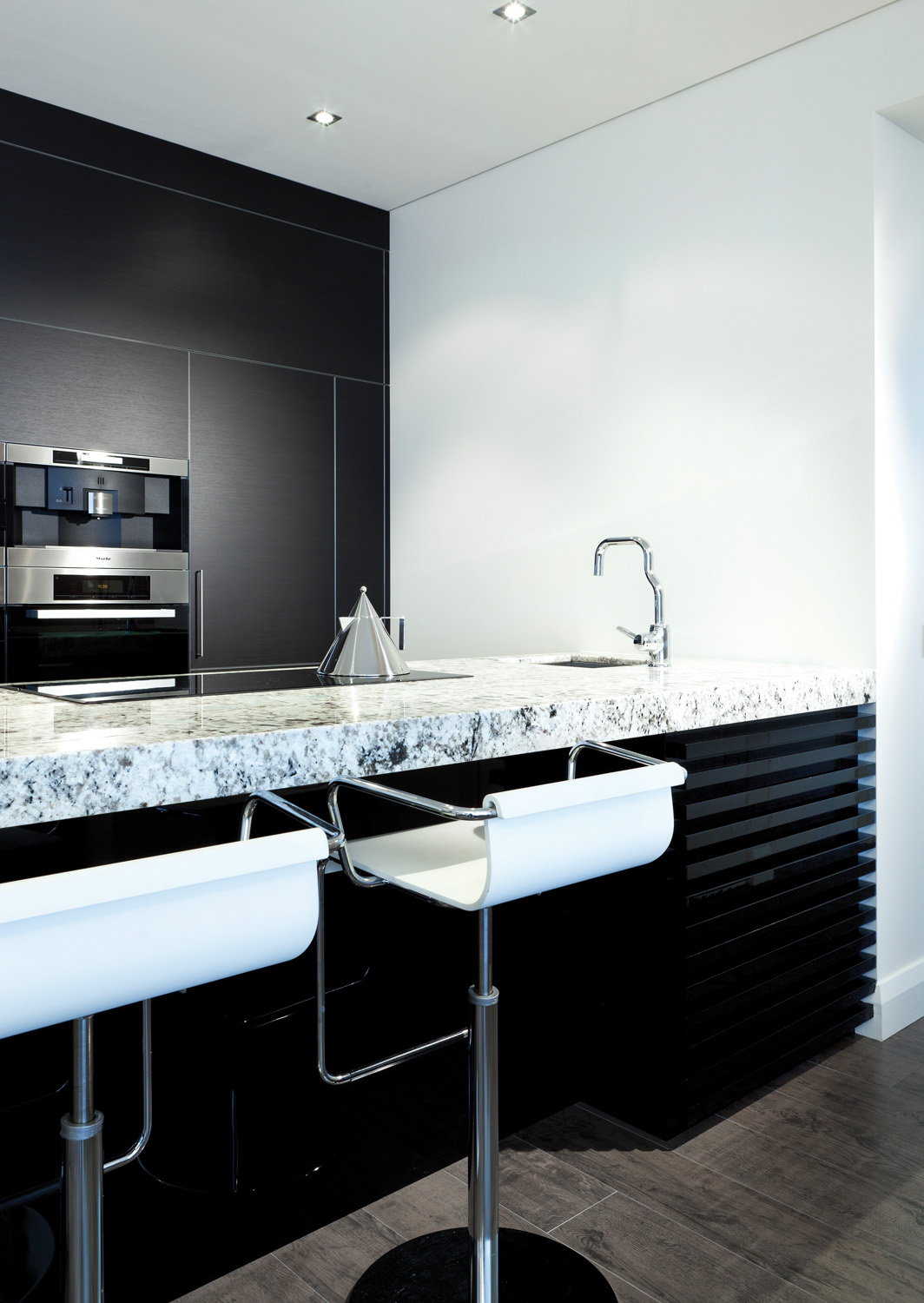 Embracing this handle-free and seamless finish, Con added to the effortlessly cool design, incorporating stainless-steel kickboards and Miele appliances, including an oven, cooktop and dishwasher. The Franke taps and sink add to the contemporary design of the kitchen.