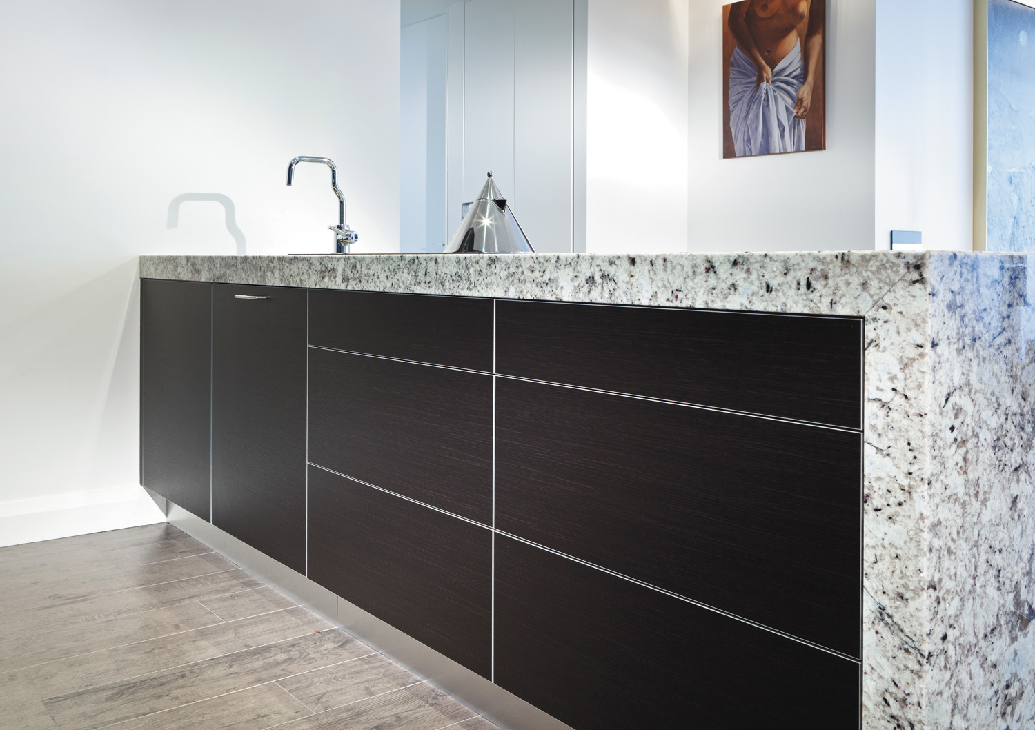 The size of the space was on the small side; however, the designer saw the challenge as an opportunity to be creative. Con used Servo-Drive by Blum to create pull-out drawer and pantry systems, creating what is now a clean-lined and clutter-free work zone.